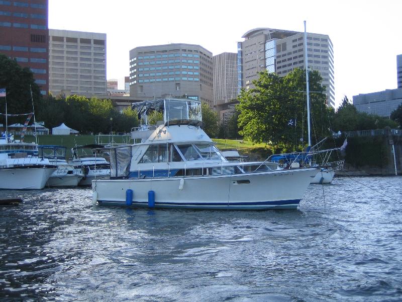 A restored 38 Commander Sport Fisherman proudly anchors right in front of downtown Portland, for the Blues Festival! Featured June 28, 2006