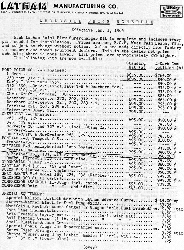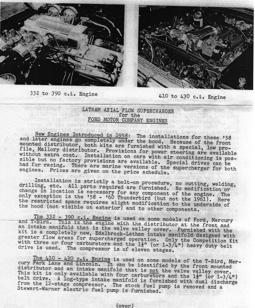 Latham Supercharger. The standard model used 2 Carter YH carbs. The competition model used 4. YH carbs were mostly used on early Corvettes and turbocharged Corvairs 1962-1966. The Latham competition model for 430 MEL was $935 wholesale back in the day, plus 25% for retail !! Asking prices for these setups are usually $3,000-$5,000+ but are seldom complete setups anymore. I've seen them as high as $10k.
