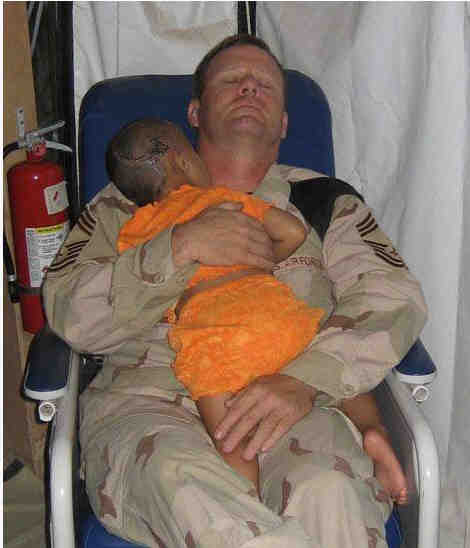 The nurses said John is the only one who seems to calm her down, so John has spent the last four nights holding her while they both slept in that chair. The girl is coming along with her healing.