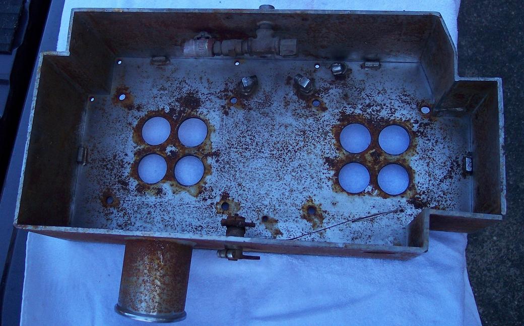 VINTAGE EARLY LINCOLN V8 SUPERCHAGER CARB BOX. FOR 2X4 314,368, HAND MADE FROM STEEL, CAME IN THREE PIECES, MISSING TOP. AS I REMEMBER IT WAS FLAT AND HAD LONG BOLTS THAT WENT THROUGH THE TOP AND INTO THE THREADED BASE, IT HAD A LINCOLN EMBLEM ON IT AND COOL SPAULDING AND STROPPE DECALS.
