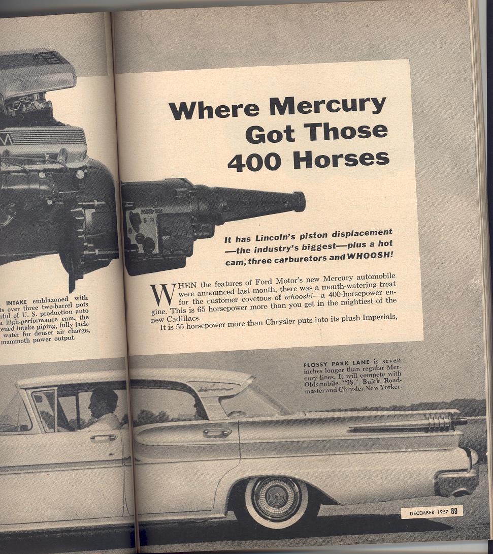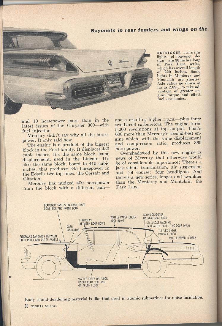 "There is also another little dandy currently referred to as a 'Super Marauder.' Bill Stroppe originally worked up this one for the use of ambitious cops chasing ambitious speeders. But a nice touch offered by Mercury this year is that this same daisy-flattener is offered to the taxpayer-- the first break this guy's gotten in years. The Ford Motor Company has been building up a reserve of new engines for several years. This newest Mercury-Lincoln offering (with a claimed 400-hp rating) is the greatest in Ford's history." http://www.mercurystuff.com/temp/1958-M ... ercury.swf