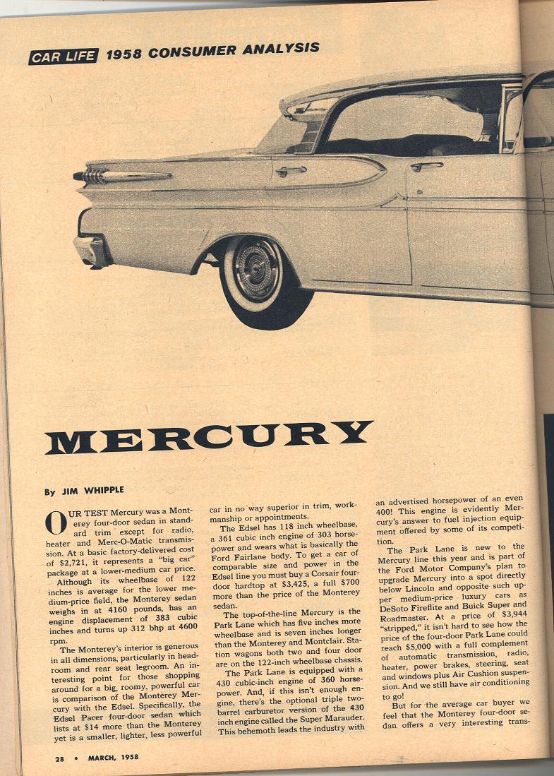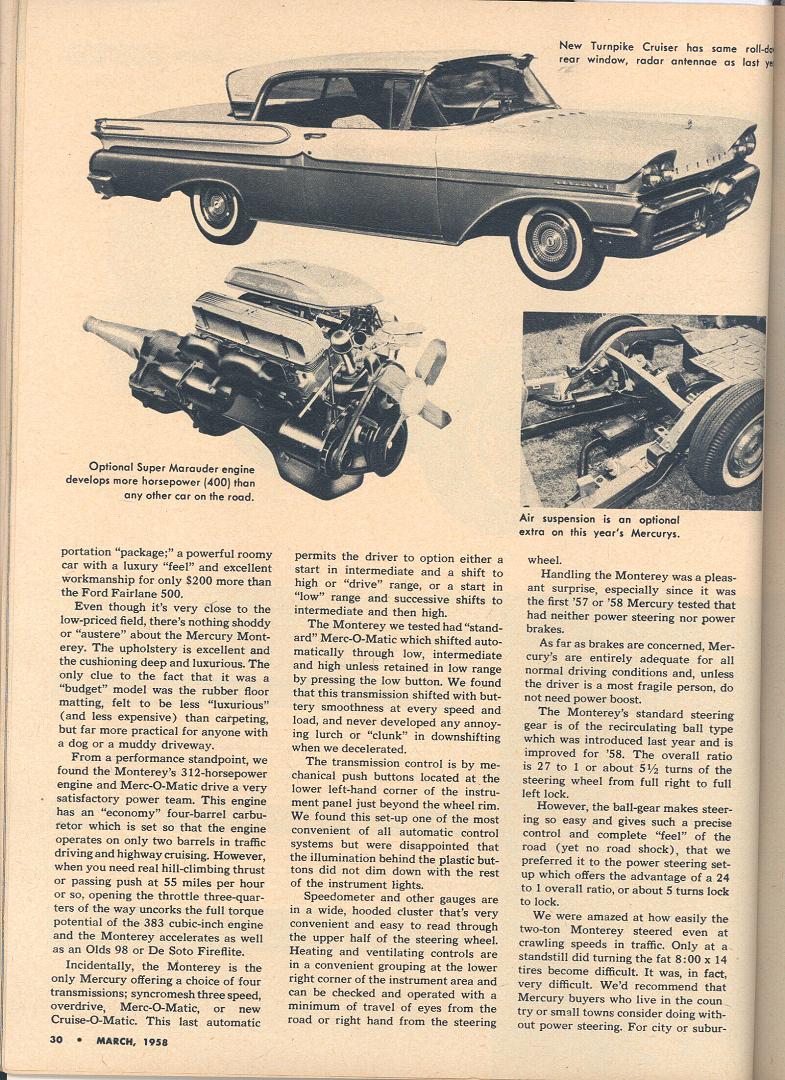 Bruce McCahill reported on a test-drive of the 1958 Mercury in Mechanix Illustrated (February 1958). In that article, he states: