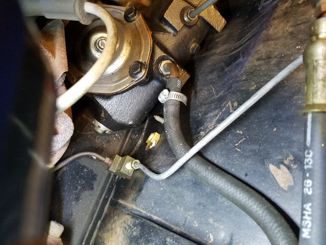 Here is the Junction where one rear and two front brake lines meet.The line running up to the master I will reuse. For the two front brake lines. I will block off the rear brake line port with a plug. I will add an additional junction for the rear brake line and extended it up to the master. The line traveling down is the right front brake. The rear line and the left front line enter the original junction block on the far side of the fire wall not visible in this picture.