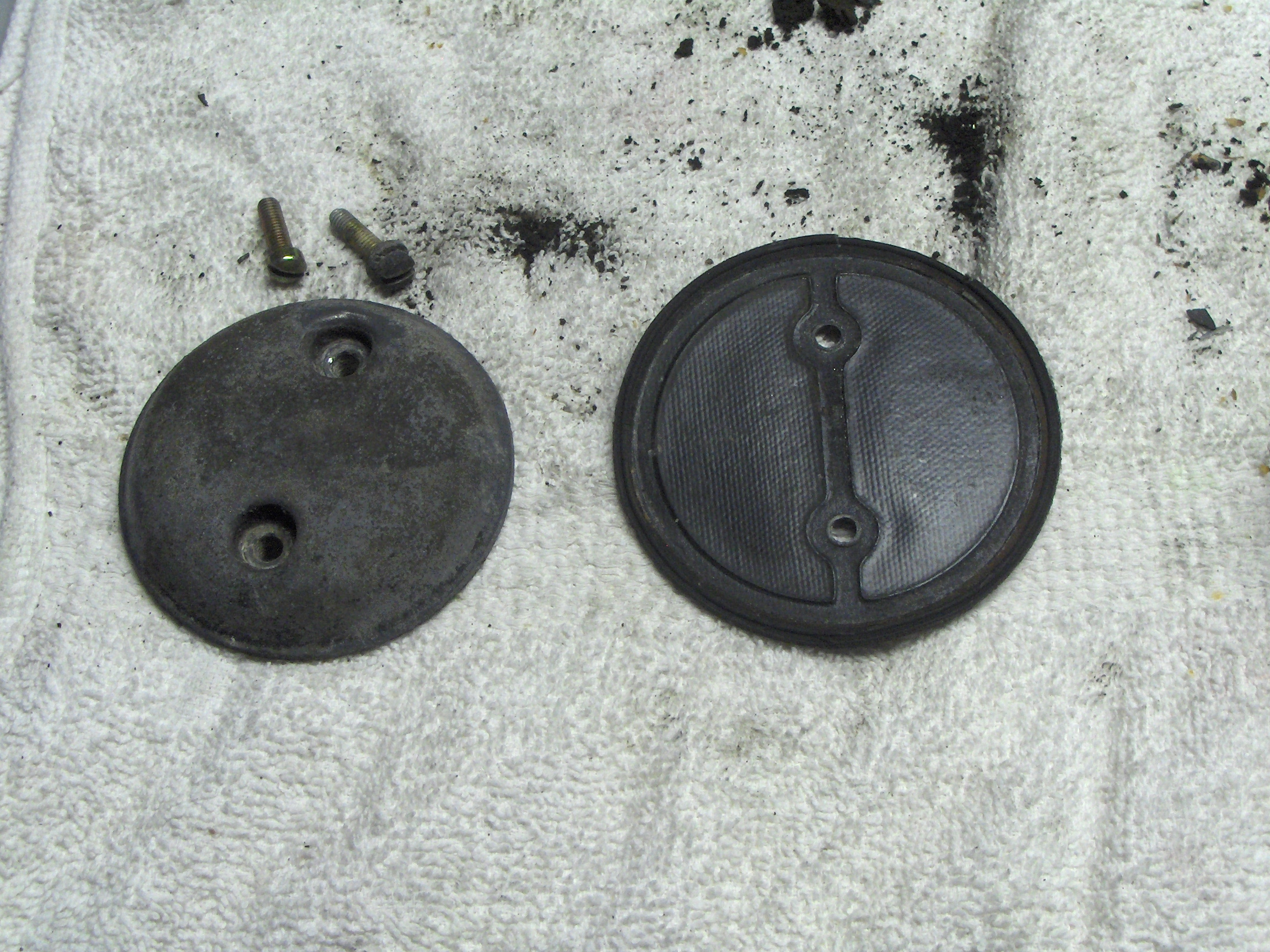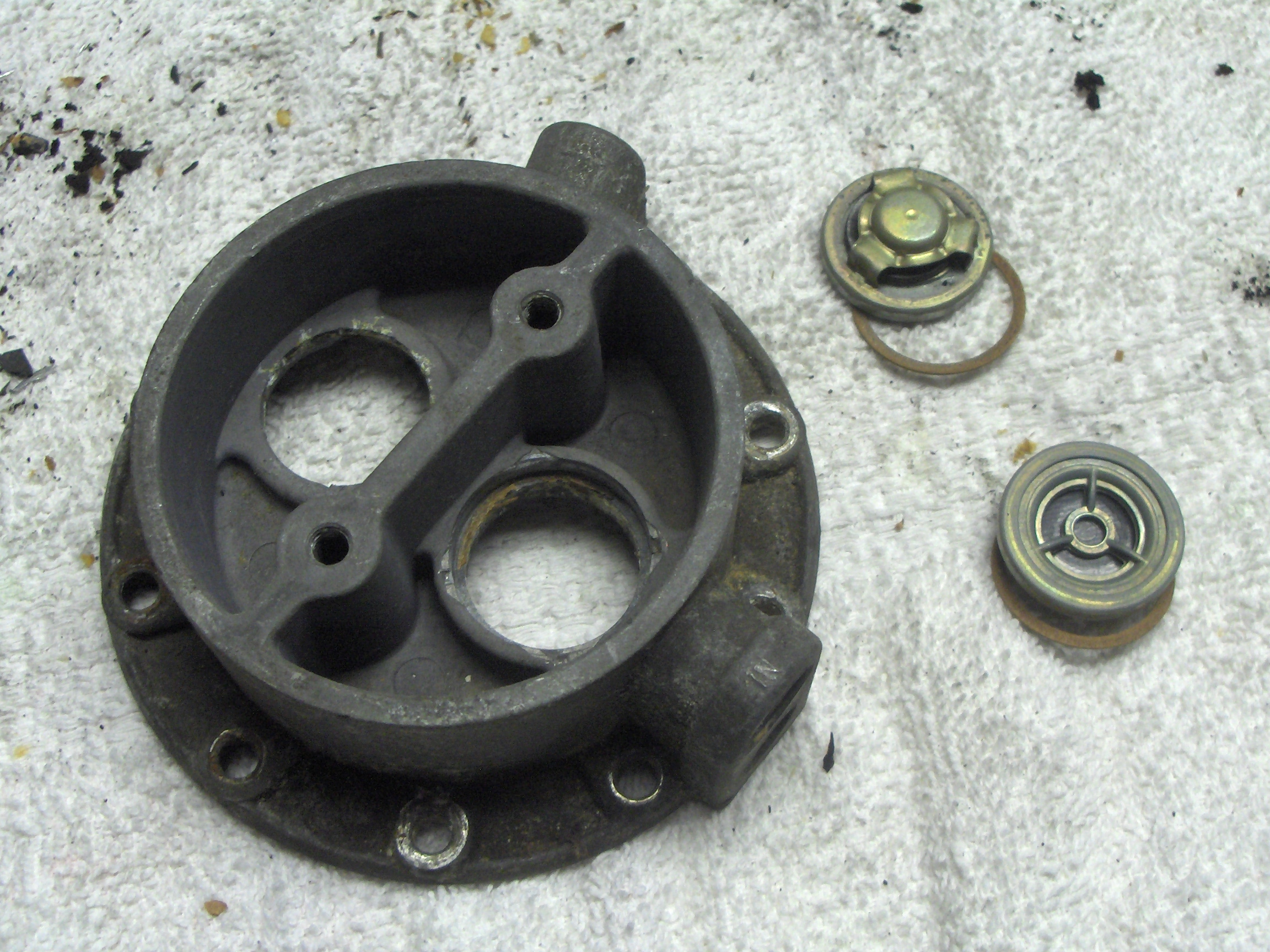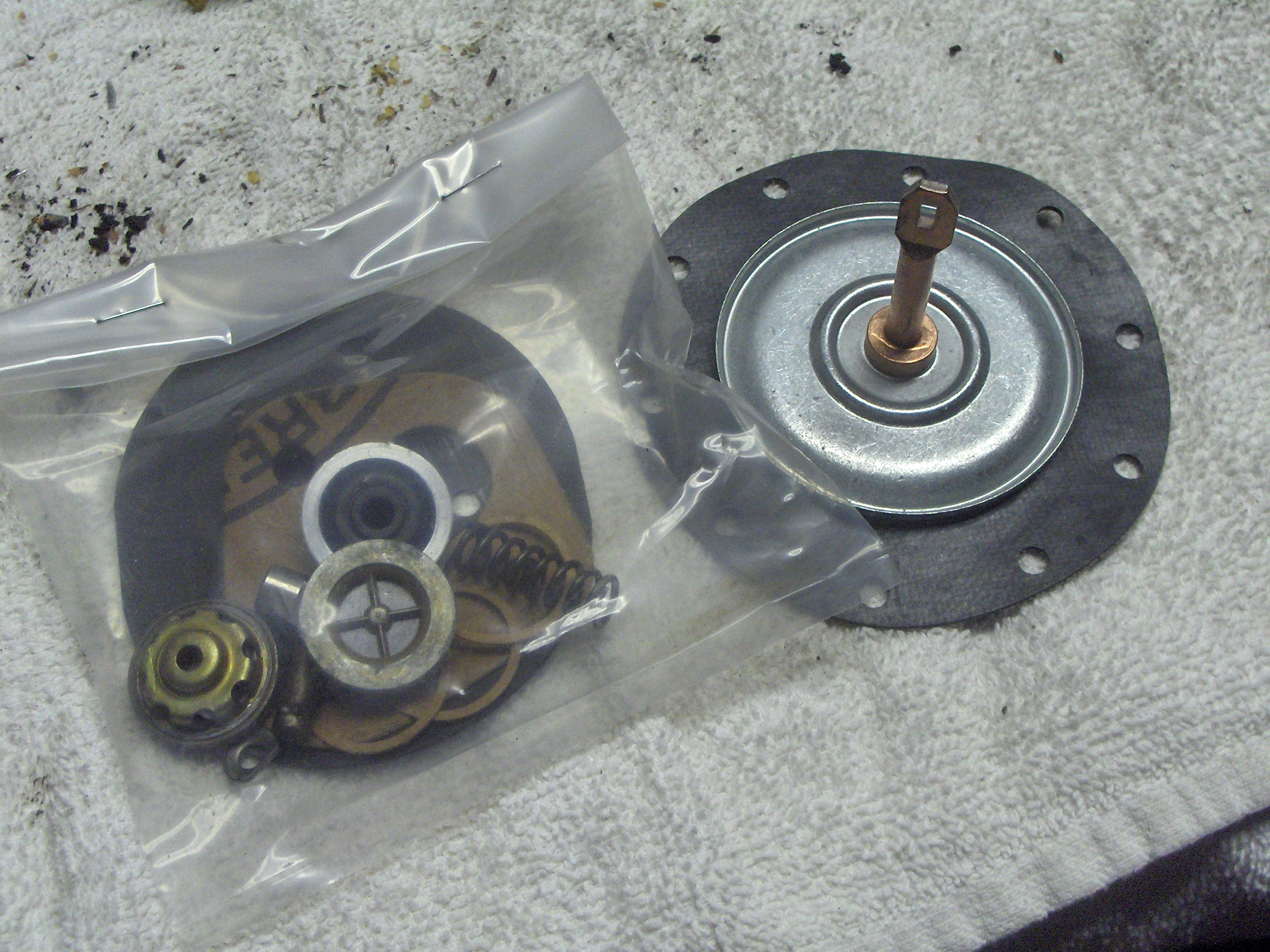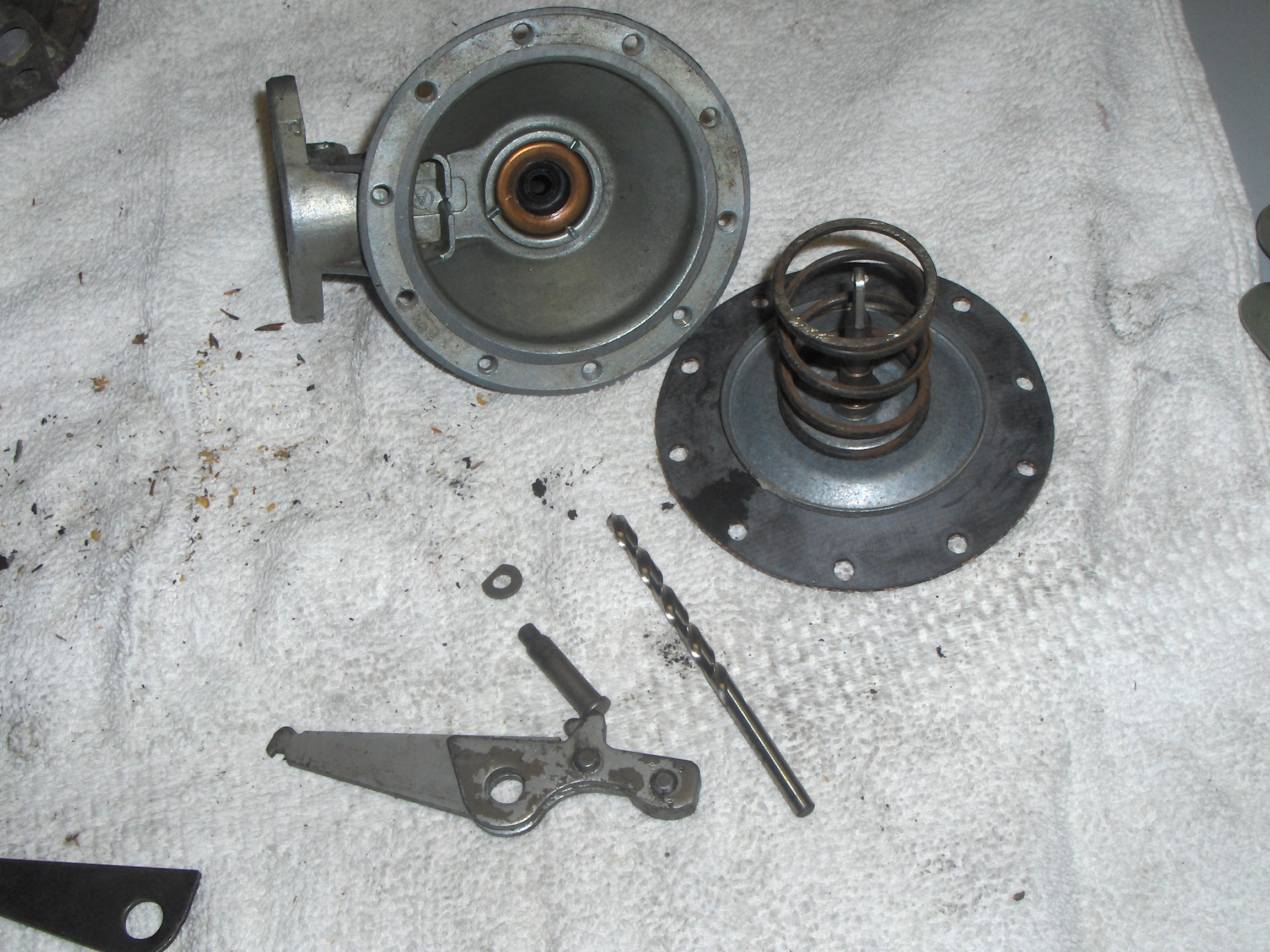 There's a surprise inside so be careful. Press the diaphragm down so the spring cant pop out when you remove the clevis pin. Take note of the assembly sequence. Also, notice the seal and copper ring pressed into the housing base. When the diaphragm leaks this seal helps to keep fuel from flooding the crank case.