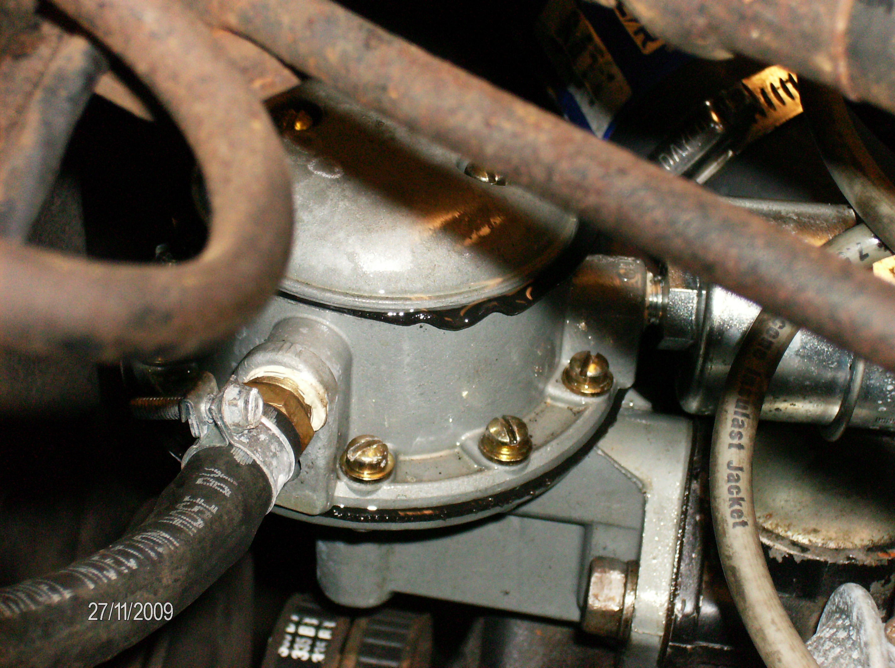 Look at the two pictures below...look carefully at this professionally rebuilt unit (from the New England Area) .... I personally purchased this pump from a pro shop. From day one it was nothing but trouble. If you look carefully at the first one you can see that the casting is actually arched between the screws. This is caused by over tightening the screws. The other reason is the fact that someone used a belt sander to make the two casting halves flush with one another. This will weaken the casting. If you see this arched condition with your pump or the half's do not mate flush use another casting. When the casting do not mate flush to one another this can cause hard starts (sucking air). In the second photo fuel is leaking after warm up. This pump has been destroyed by the re-builder. Its trash.