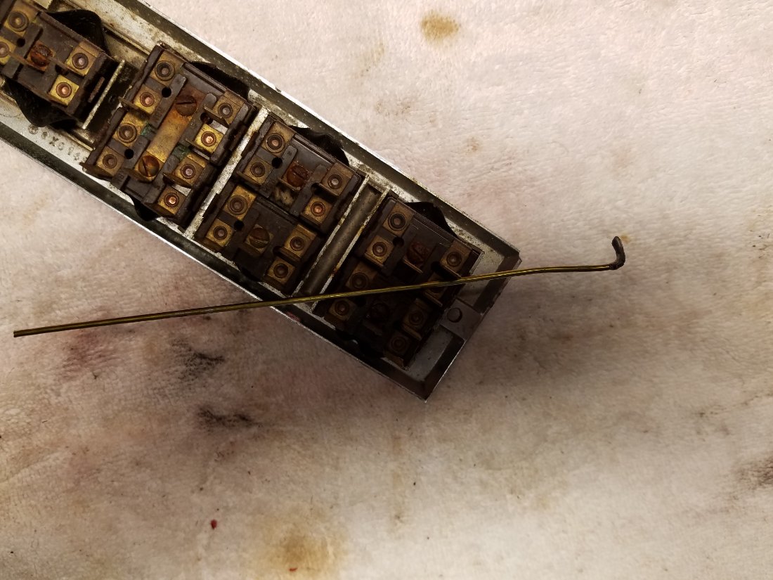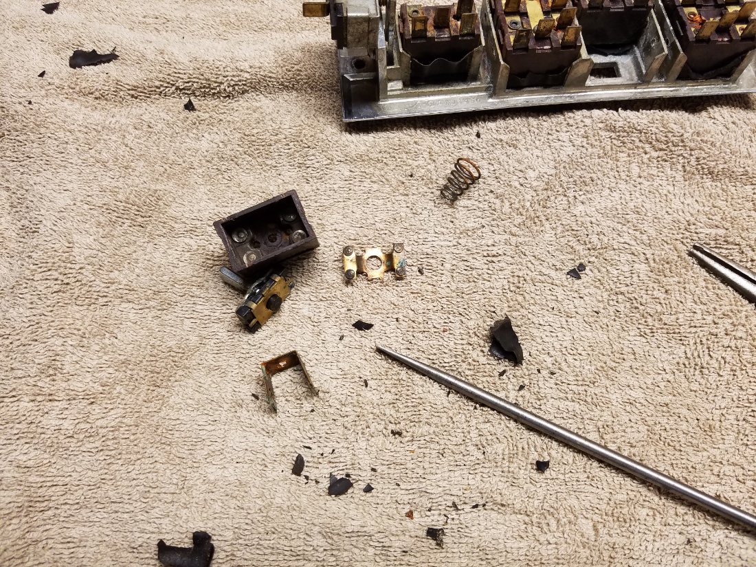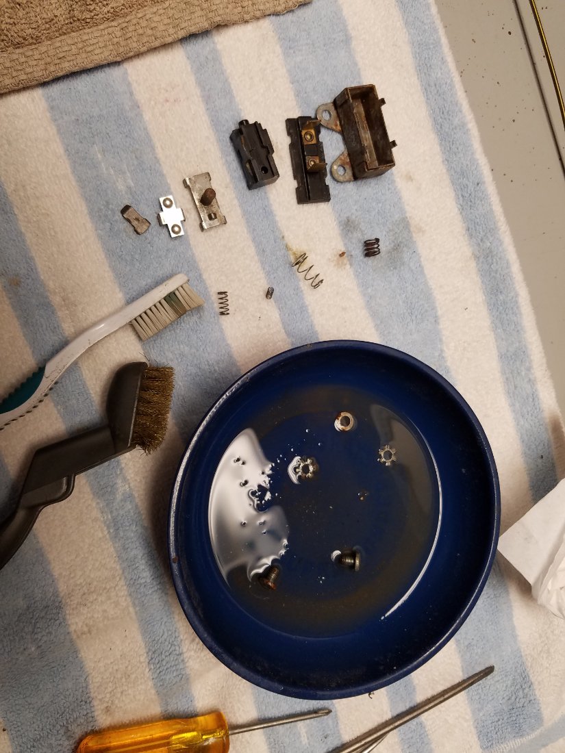 Thoroughly clean all the parts. I used a brass brush tooth brush and Isopropyl Alcohol. Notice the deteriorated rubber that protected the switch at one time. More on that later.