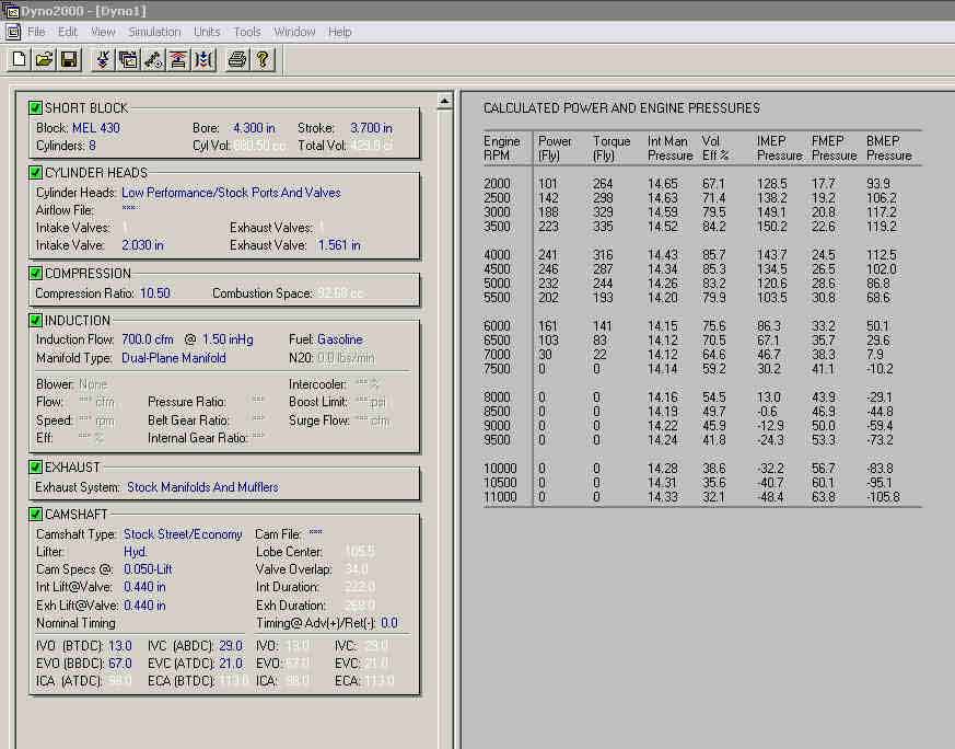 Hi, I have this old Dyno 2000 on my desk top. I played with a few MEL 430 numbers such as camshaft specs. provided by Rick "Shelby#18" and printed out these results.