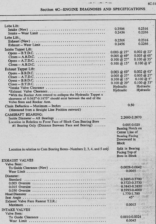 Like the intake listed above 258 is a bit long @.050 but just about right for total duration@.006). My figures on this cam show it to be a little worn at 248 in and 250 ex @.006 and 192 in and 202 ex @.050 and lobe lift total of .240 (down .010 from spec) the cam is correct with a ^(triangle casting before the last cam brg)