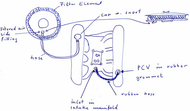 One bank draws fresh air from the inside (Clean air side) of the air cleaner housing right into the pcv valve which sits in a rubber grommet in the valve cover.