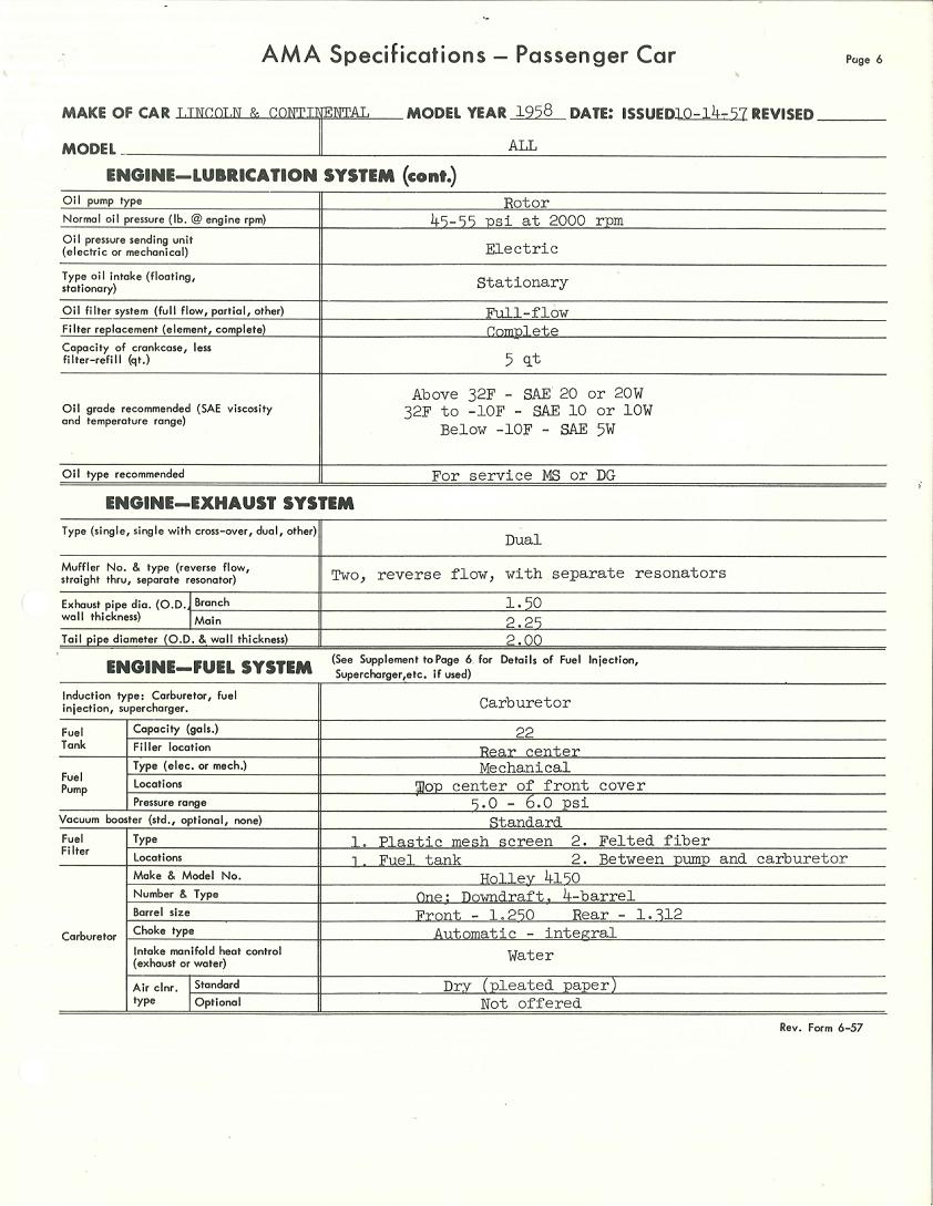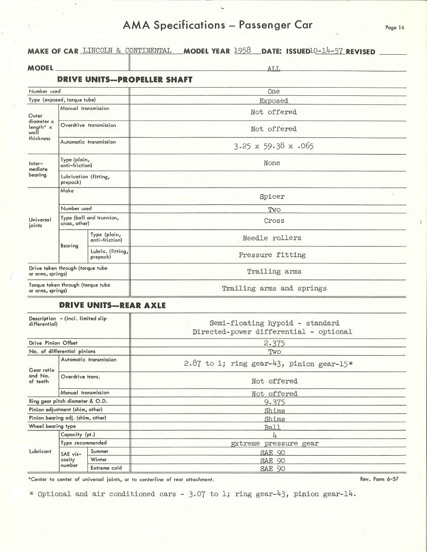 1958 Lincoln & Continental AMA Specifications (10-14-57)