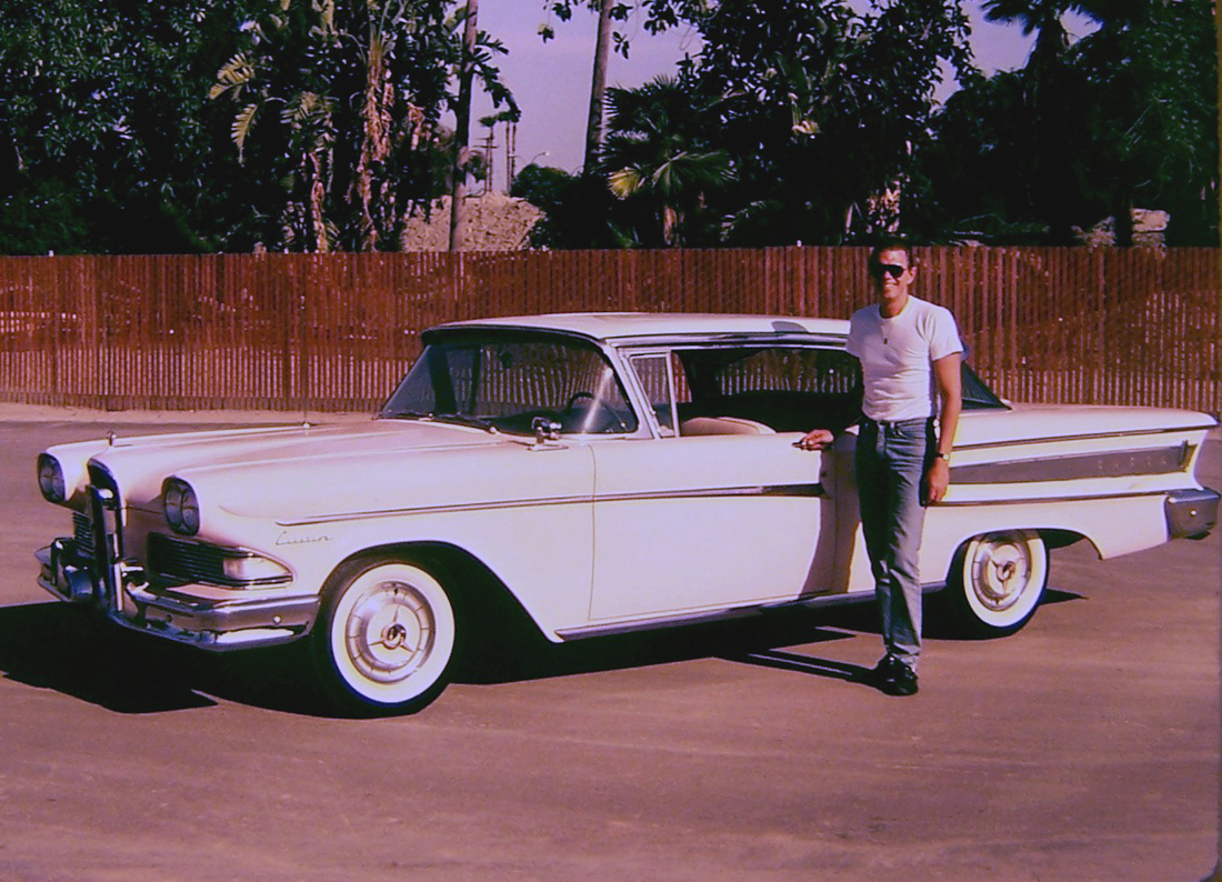 This is recording star Richard Carpenter (of the singing duet "Carpenters") and his 1958 Edsel Citation two-door hardtop in its correct factory colors of Chalk Pink and Frost White.