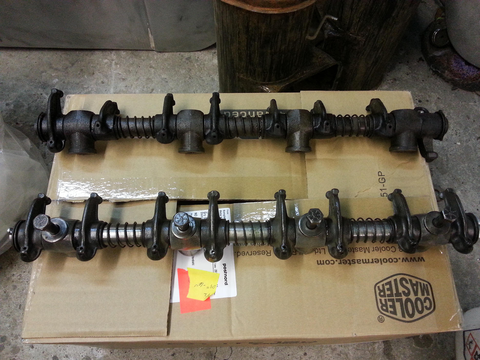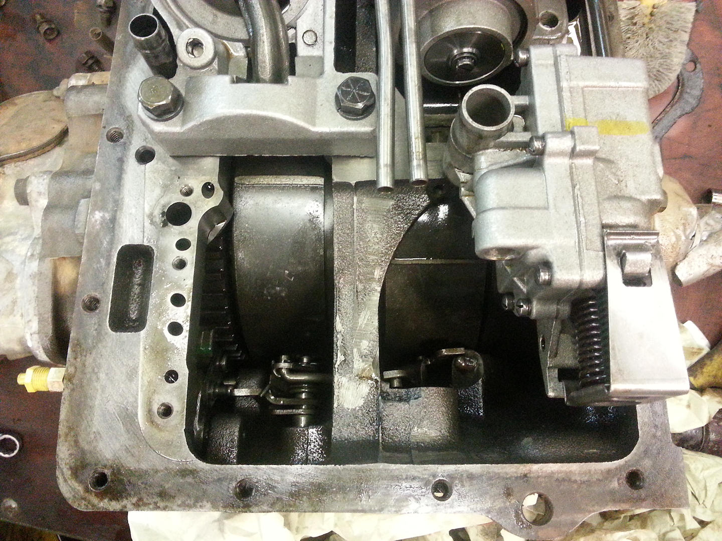 I have cleaned and stored away some internal engine parts that didn't need work, like the rocker arms, rods and pistons and the crank. Here is the rocker arm mechanism, one has been disassembled, cleaned and inspected before it was put back together again with a special protective engine lubricant.