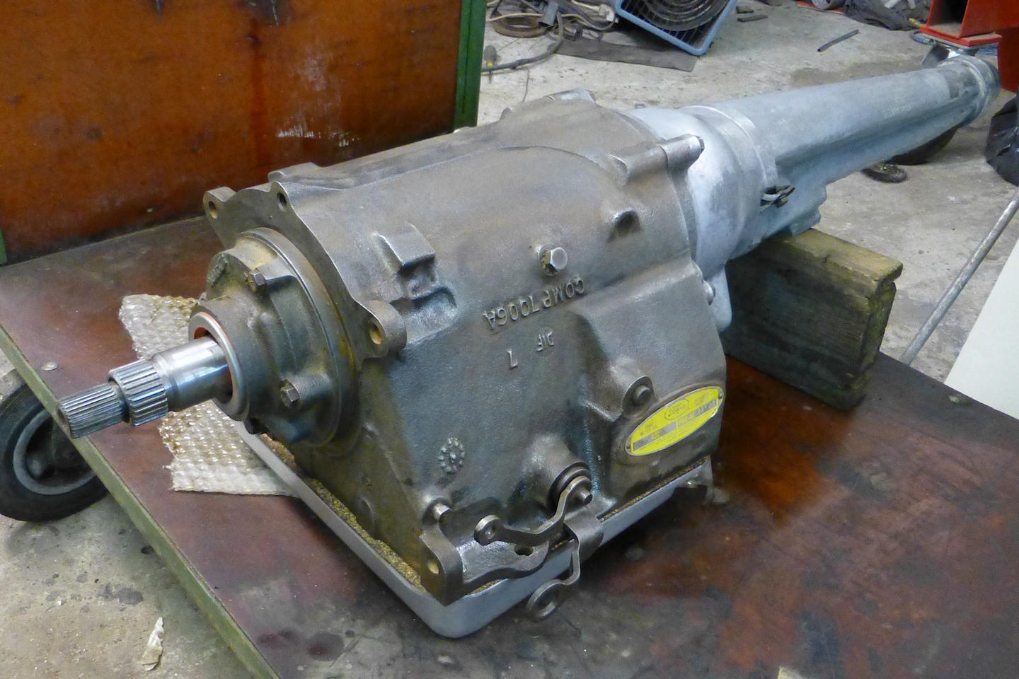 The transmission is back together with the new seals. I painted the oil pan flat silver grey before I put it back on and also cleaned the housing with a wire brush. As you see I prefer to keep the transmission natural cast iron and aluminum just like the factory did.