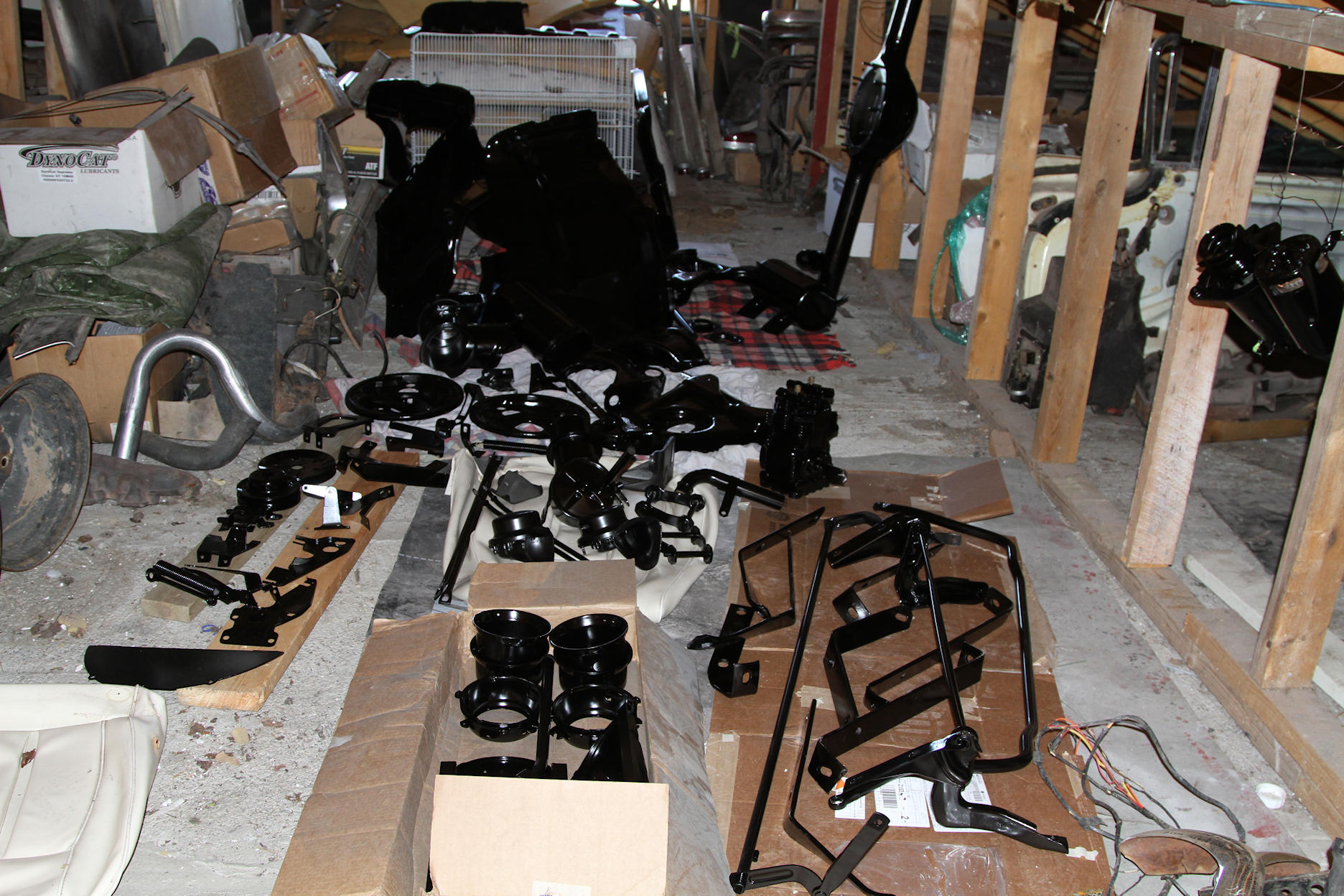 Here are most of the fresh repainted parts up on my garage loft resting and curing while I am working on other things.