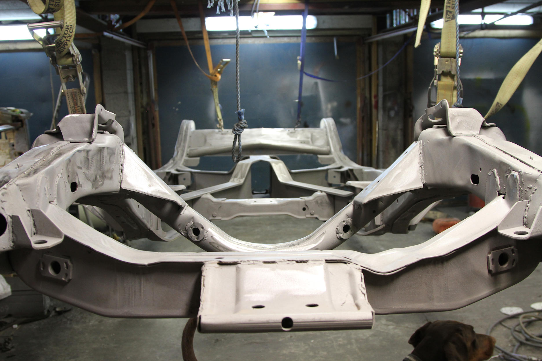 So I hung it up in my garage and started the paint prep work. The whole frame needed to be sanded to make the surface smooth and nice and I also used a little bondo here and there to remove signs of previous surface rust.