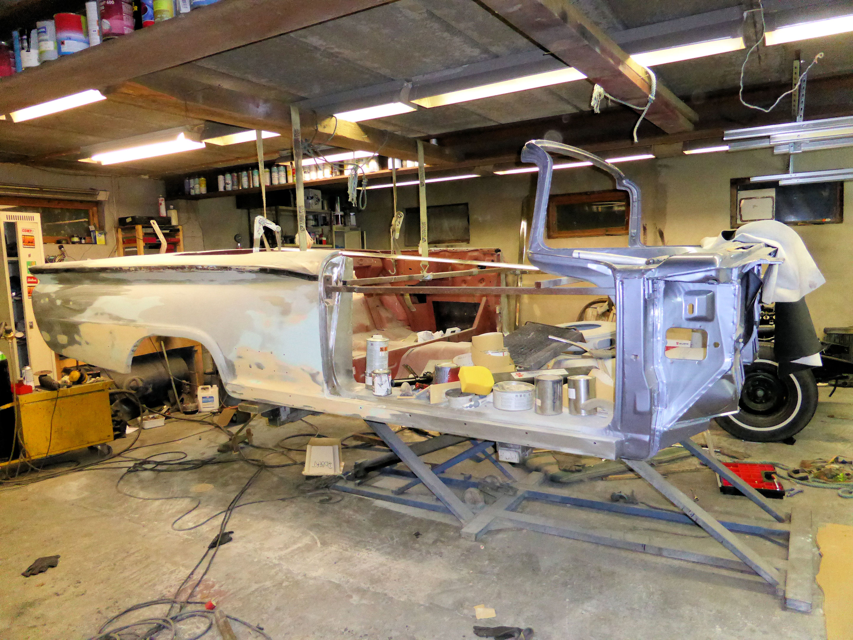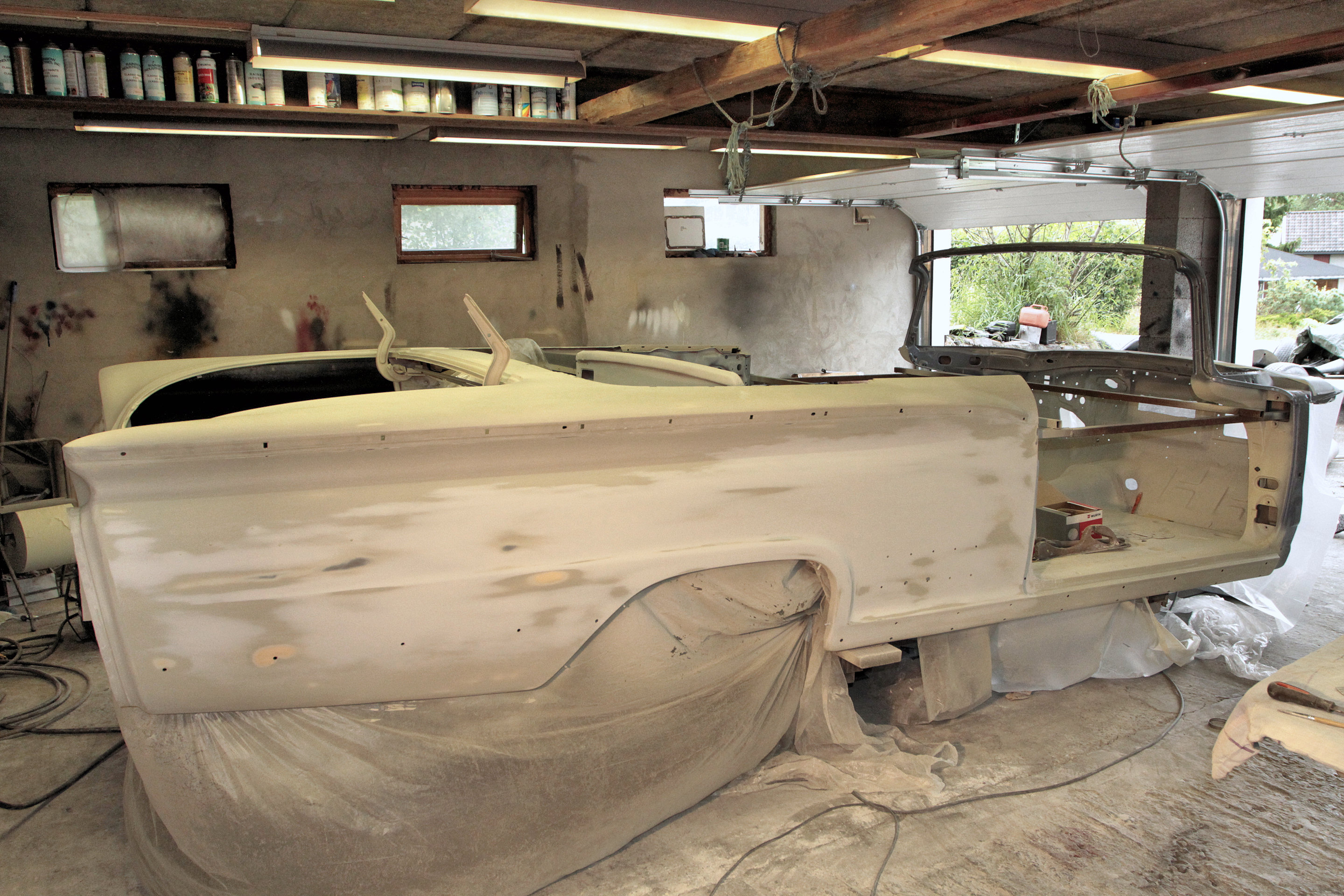 In early spring 2015 I started the paint preparation work on the body. I first did all the bondo on the quarter panels and trunk lid and then let it rest for a few months before I continued. But before I continued I also removed the body off the frame again and put it on my lift. That makes it easier to work on the body and also no risk of getting over spray on the frame.