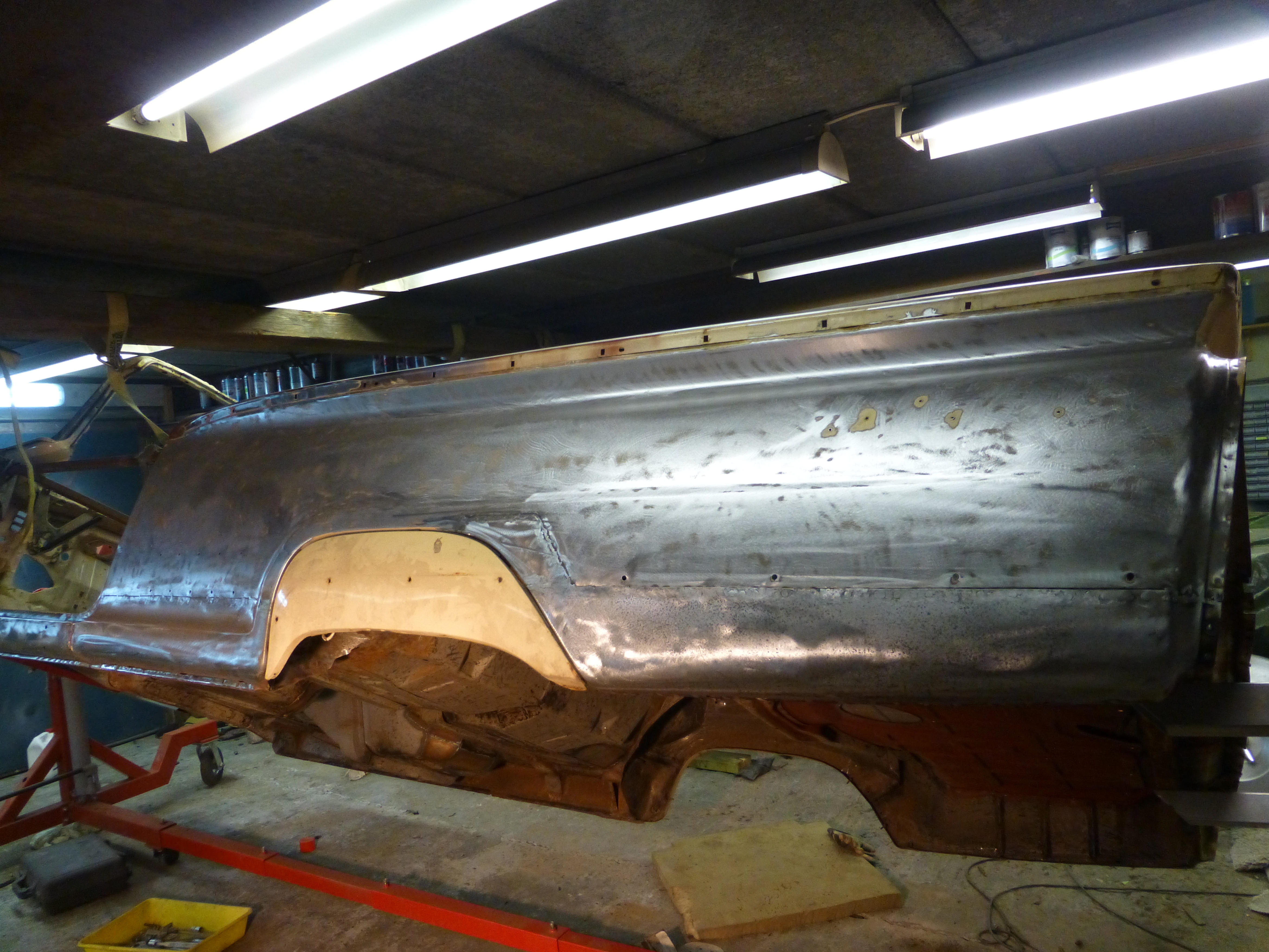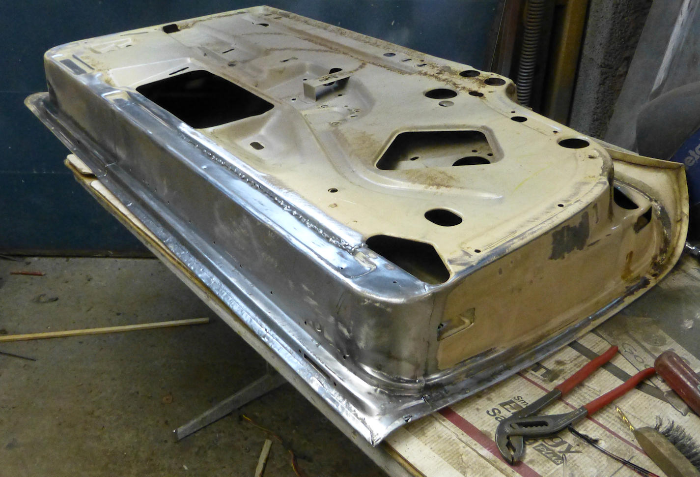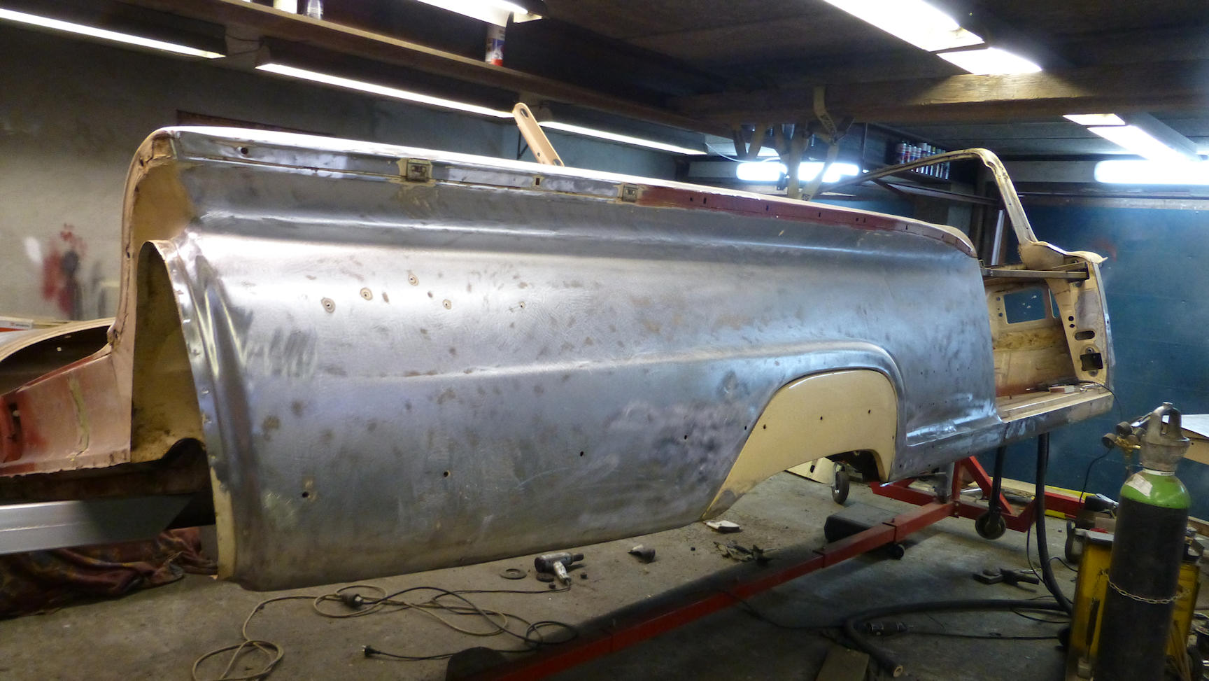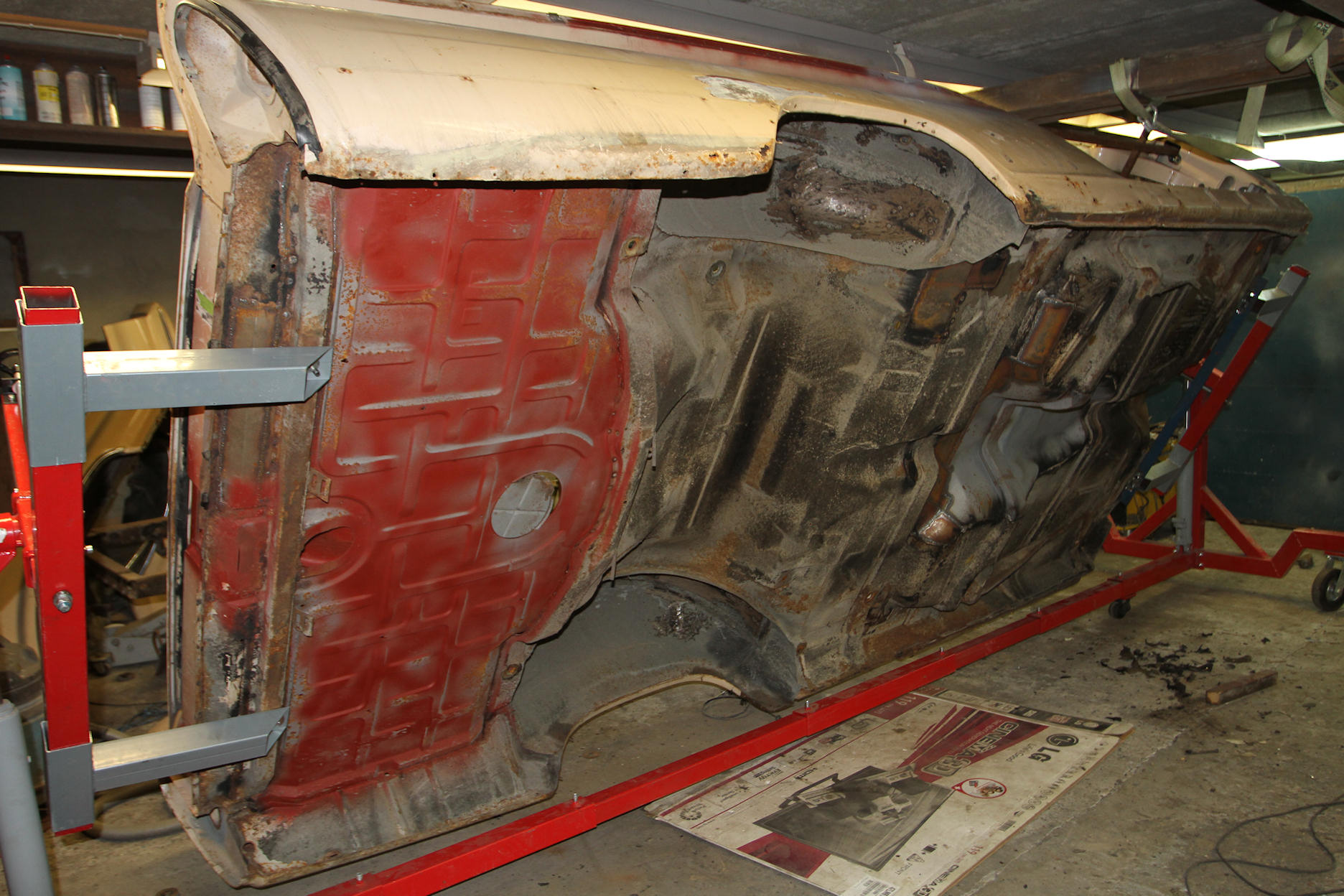 My hardtop is becoming a convertible. All the convertible parts had been removed from the rusty convertible by drilling out the factory spot welds and then transplanted into the hardtop body so it would be near impossible to see that this car body was a hardtop. Some people would prefer to take the good parts from the hat parts car and transplant them over to the convertible, but in this case I think that would have made a not so good result in the end.