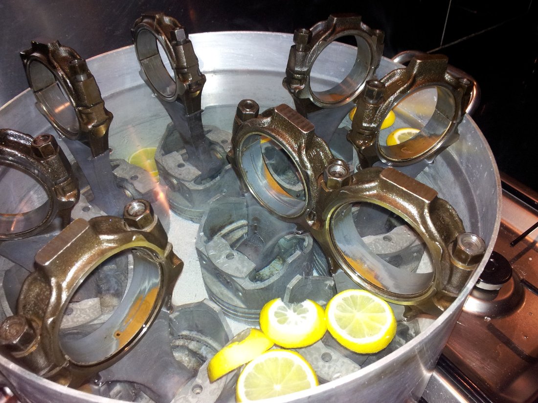Main bearings were ok (no wear) so I could reuse them. I managed to remove the pistons very carefully without any damage to the pistons and bores. Measured everything and they were still within spec. So I removed carefully the rings and installed new ones, a did a light hone to the bores.