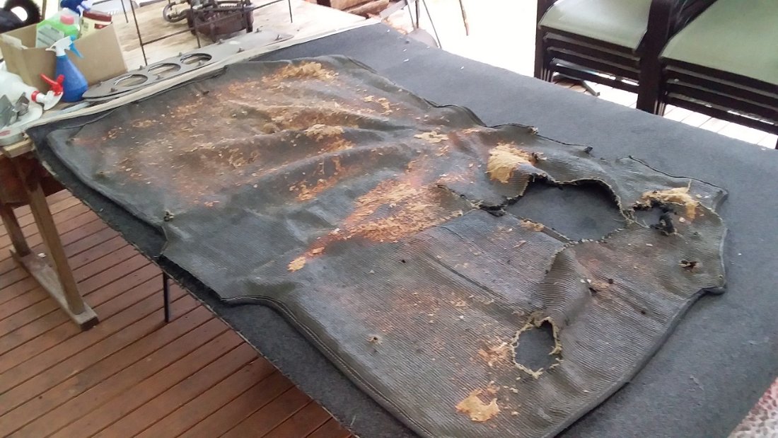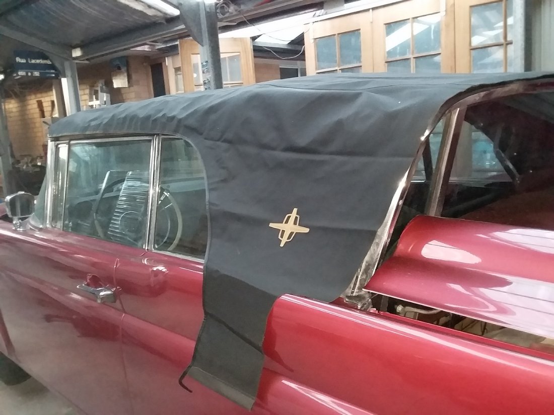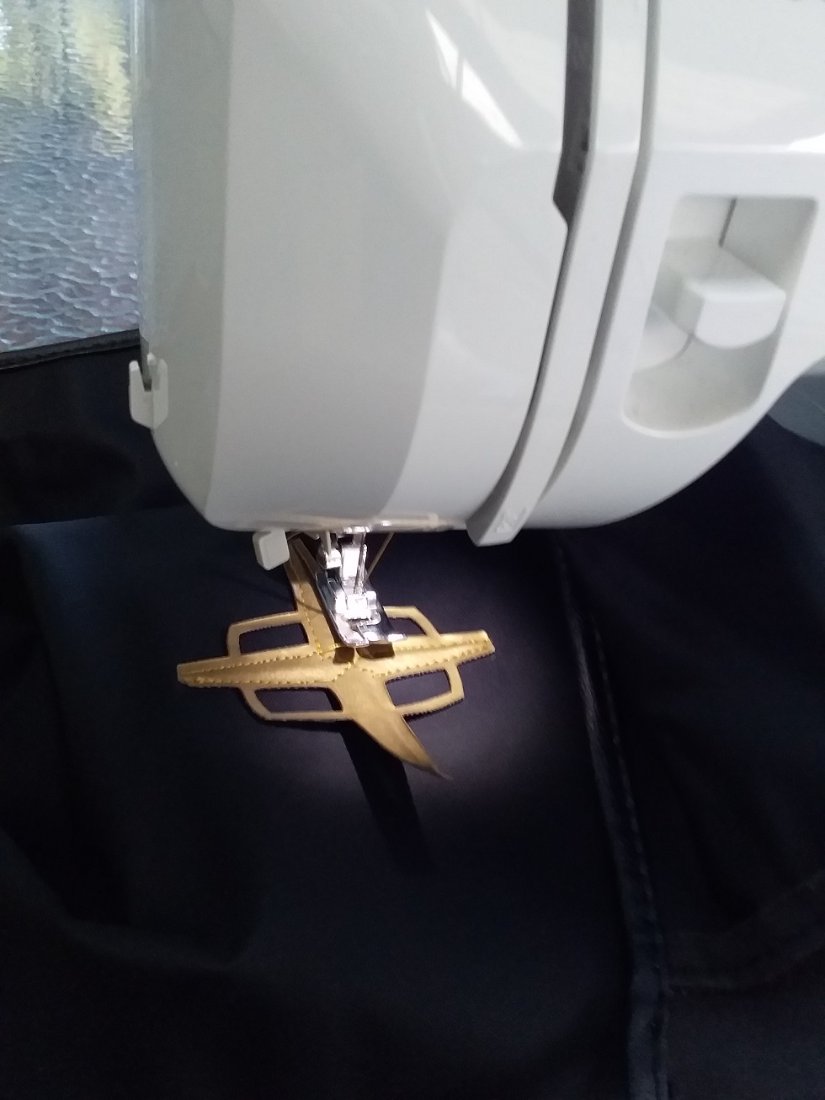 Sewing 4 point logo to new top material (logo scavenged from the original top).