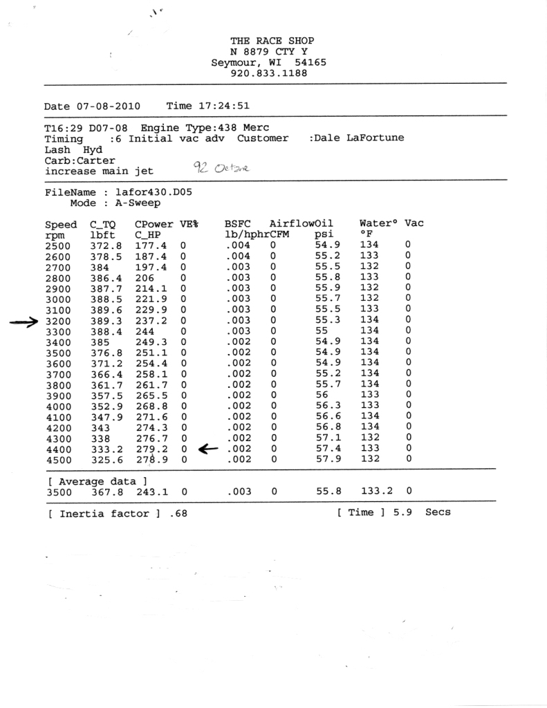 As stated the dyno results were not what I expected. But after talking to others and doing some research I have been satisfied. The next step will be the rear wheel hp dyno after the car is complete. Attached are the results, more photo's, and a link that helped me to understand the results.