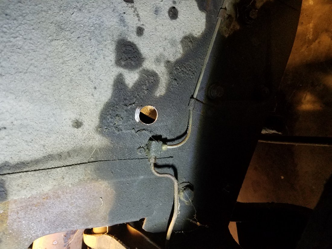 Here is the Junction where one rear and two front brake lines meet.The line running up to the master I will reuse. For the two front brake lines. I will block off the rear brake line port with a plug. I will add an additional junction for the rear brake line and extended it up to the master. The line traveling down is the right front brake. The rear line and the left front line enter the original junction block on the far side of the fire wall not visible in this picture.
