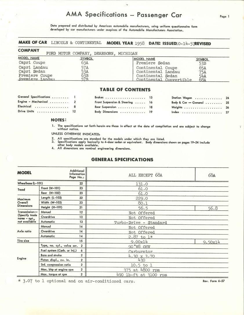 Re: 1958 Lincoln & Continental AMA Specifications (10-14-57)