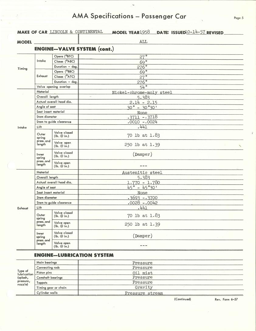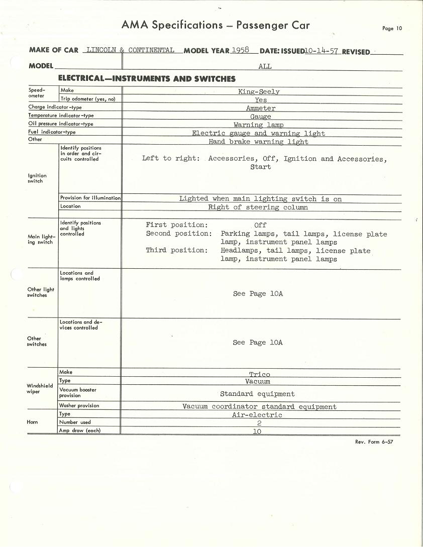 1958 Lincoln & Continental AMA Specifications (10-14-57)