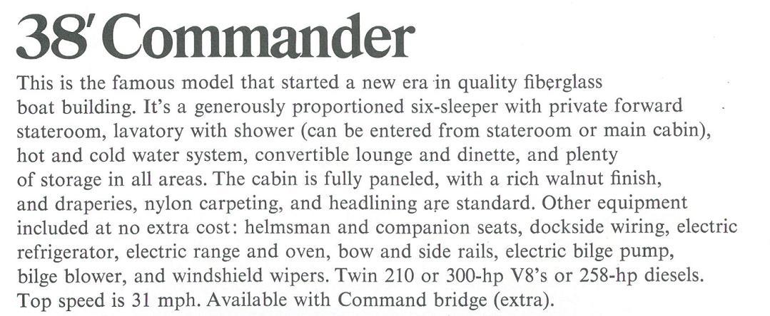 CHRIS CRAFT COMMANDER FORUM ® .......A photo-intensive technical reference file and ongoing newsletter regarding the original fiberglass Chris Craft Commander. Our mission at this not-for-profit non-commercial web site is to "have fun and share information" for your individual personal use. Our main reference feature is the ever expanding MASTER INDEX Files which contain exhaustive photo and technical information on the Chris Craft Commander line (like these 38' Commander brochure scans) , (an awesome collection of Chris Craft 427 tuning and specification information), and a few words about how to use the information in the forum, etc. Be sure to look at the information about the 2009 Chris Craft Commander Rendezvous, second year in a row on Lake Erie!! If you're a Commander fan, this will be an event you won't want to miss.
