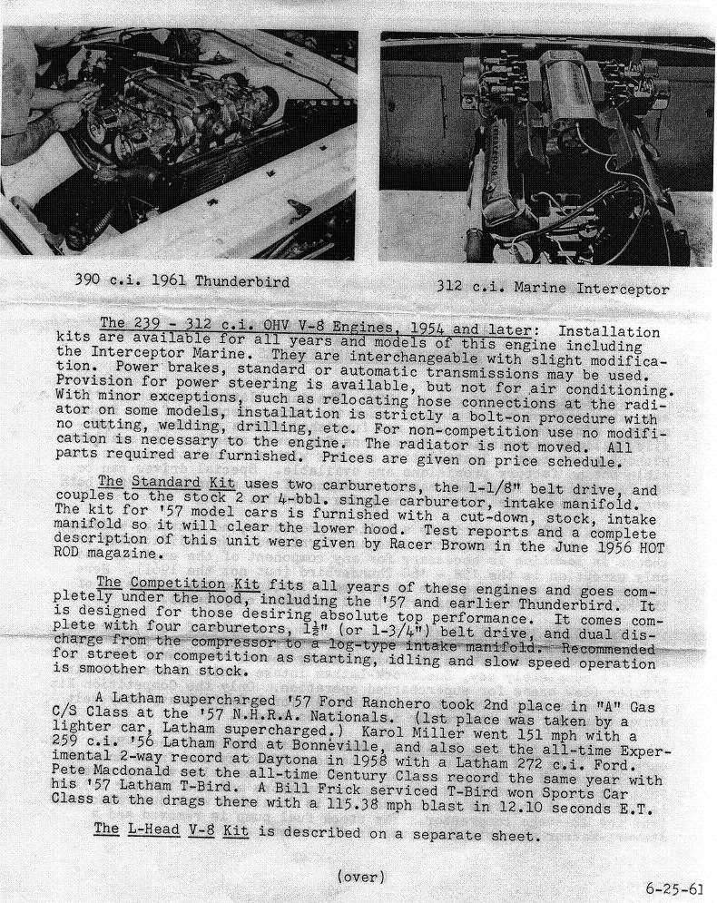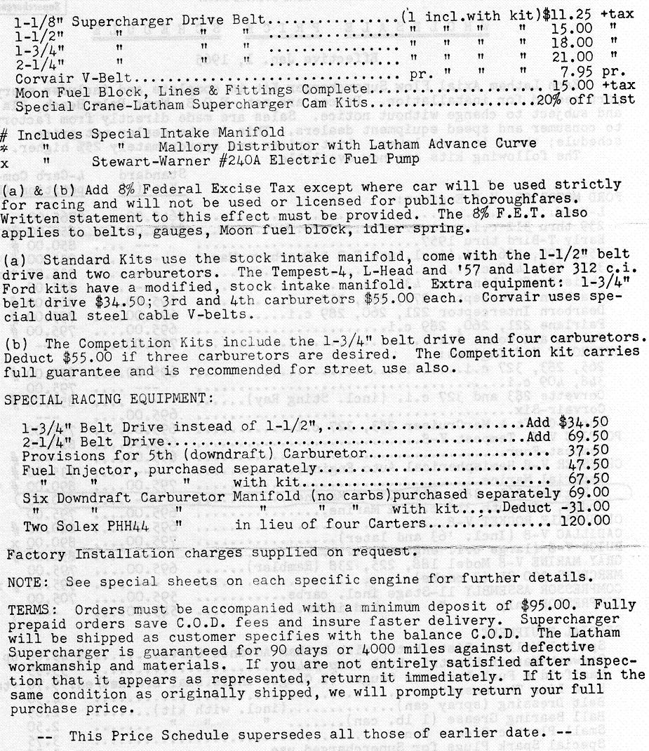 Latham Supercharger. The standard model used 2 Carter YH carbs. The competition model used 4. YH carbs were mostly used on early Corvettes and turbocharged Corvairs 1962-1966. The Latham competition model for 430 MEL was $935 wholesale back in the day, plus 25% for retail !! Asking prices for these setups are usually $3,000-$5,000+ but are seldom complete setups anymore. I've seen them as high as $10k.