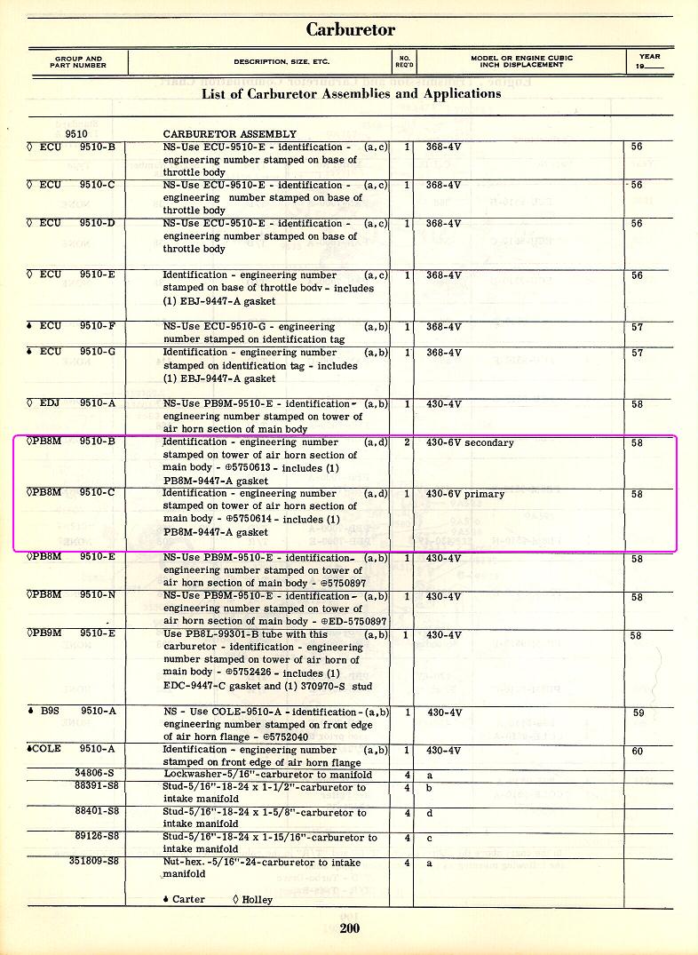 It's not clear to me if the original carburetor numbers in mid-1958 were B8A-9510-B/C or EDG-9510-B/C. They were each around $66 or $68 in 1958. Note: there was no dealer wholesale incentive for EDG-9510-B which leads me to believe that may be the listing for the Secondary carburetor for the Super Marauder. Most of the other carbs, including EDJ-9510-A which is the 430-4V carburetor, had dealer wholesale incentives to move them. An original NOS secondary carb came up on Ebay in 2012. It sold for $675-$700. You can see the original gold iridite finish and number stampings. Holley 2300 Identification