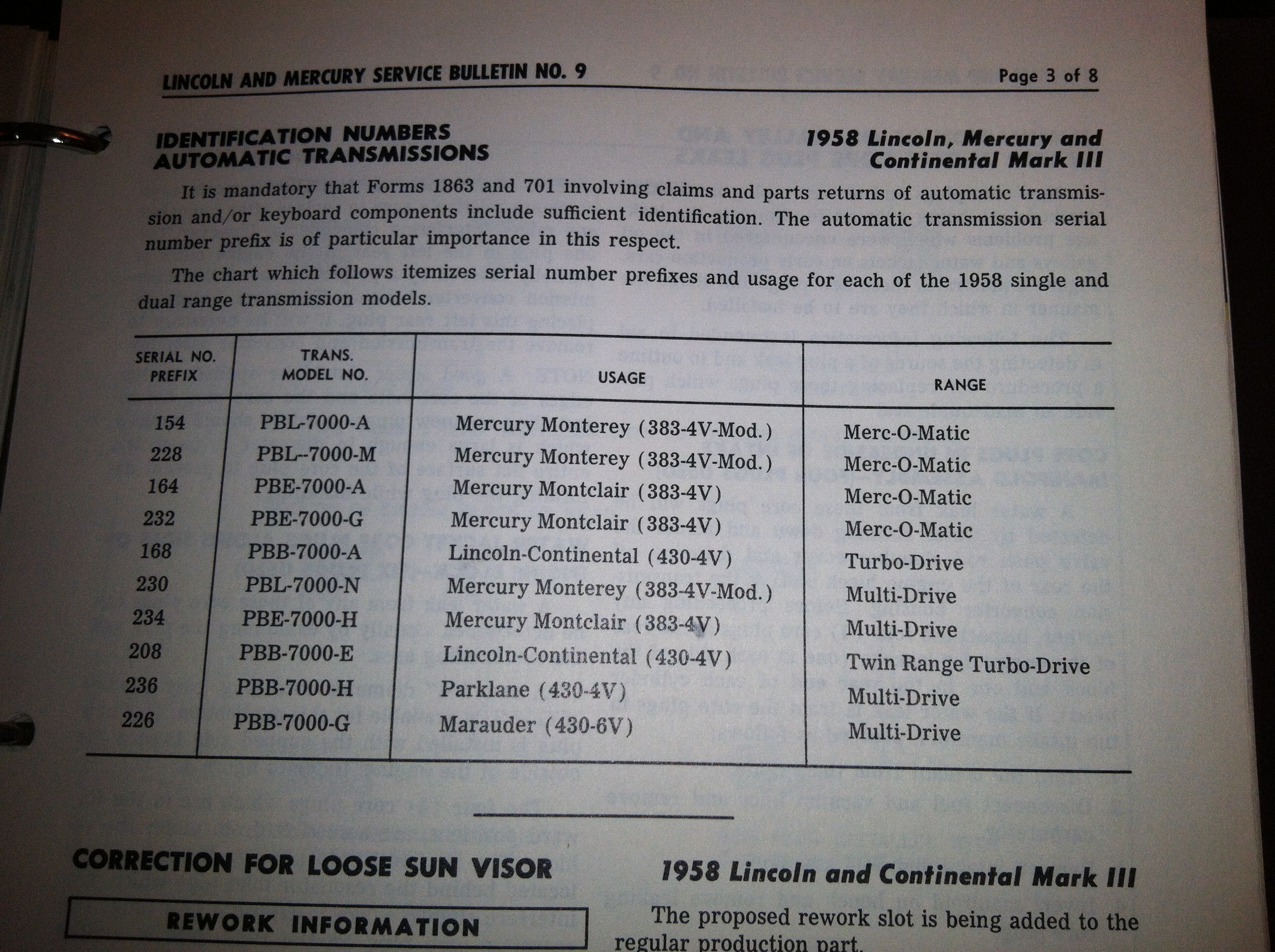 Bulletin #9 from 12/27/57, reminds that auto trans ID is very important on two forms for warranty.
