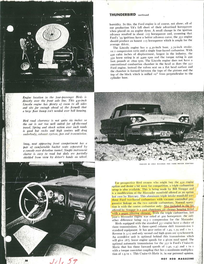 Hot Rod magazine reported the availability of the Super Marauder package for the 1959 T-bird with the 430. 1959 was the first year the 430 was offered in the T-bird, but the Super Marauder was not a factory installation. This was a conversion offered by Bill Stroppe. Supposedly a different air cleaner had to be used to clear the hood on the T-bird.