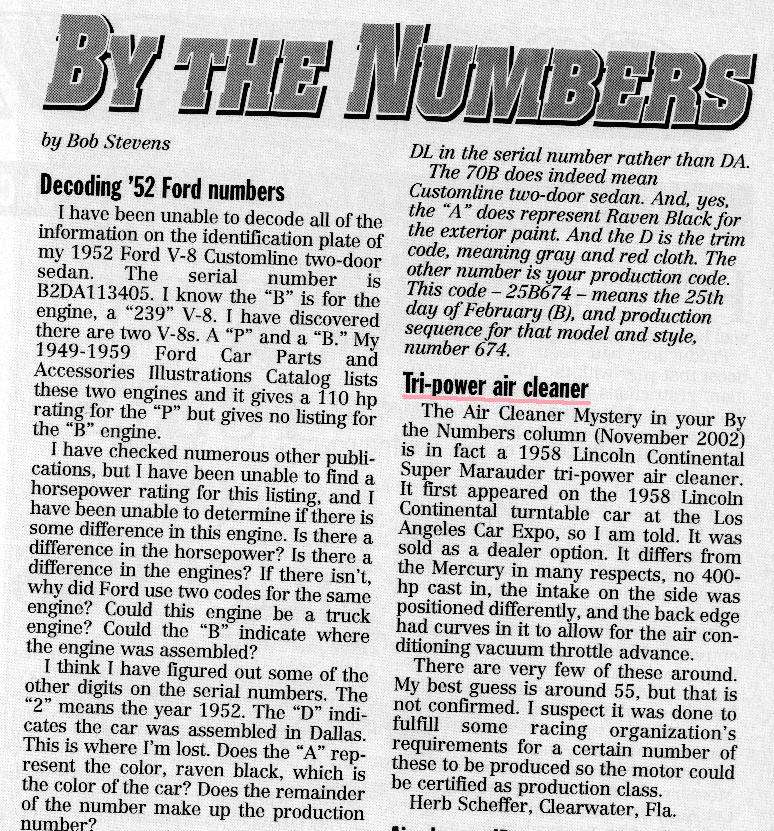 •The Lincoln air breather on the famed Jerry Capizzi 1958 Continental convertible is said by the several auctions it has ran through to have been a prototype and the closest thing to a factory installation as would have occurred. The air breather on that car was apparently not painted with red pinstripes. That car is not a J-code vin car, however by comparing its production sequence to other cars close in sequence with known build dates, it was determined that the Capizzi car was built towards the latter part of the 1958 model year run. This suggests to me that if it really was a prototype then the Lincoln tripower option was released after the Mercury version and was only officially around for a few months until all units were liquidated though the dealers.