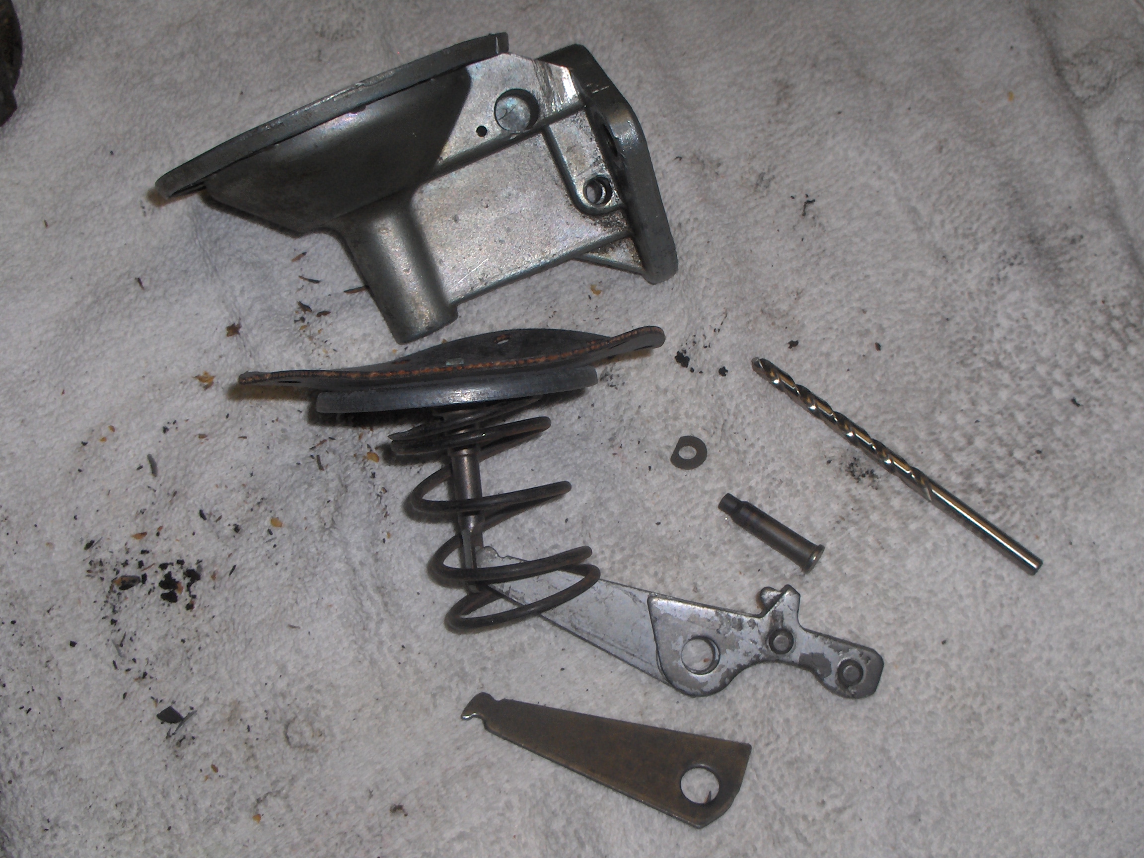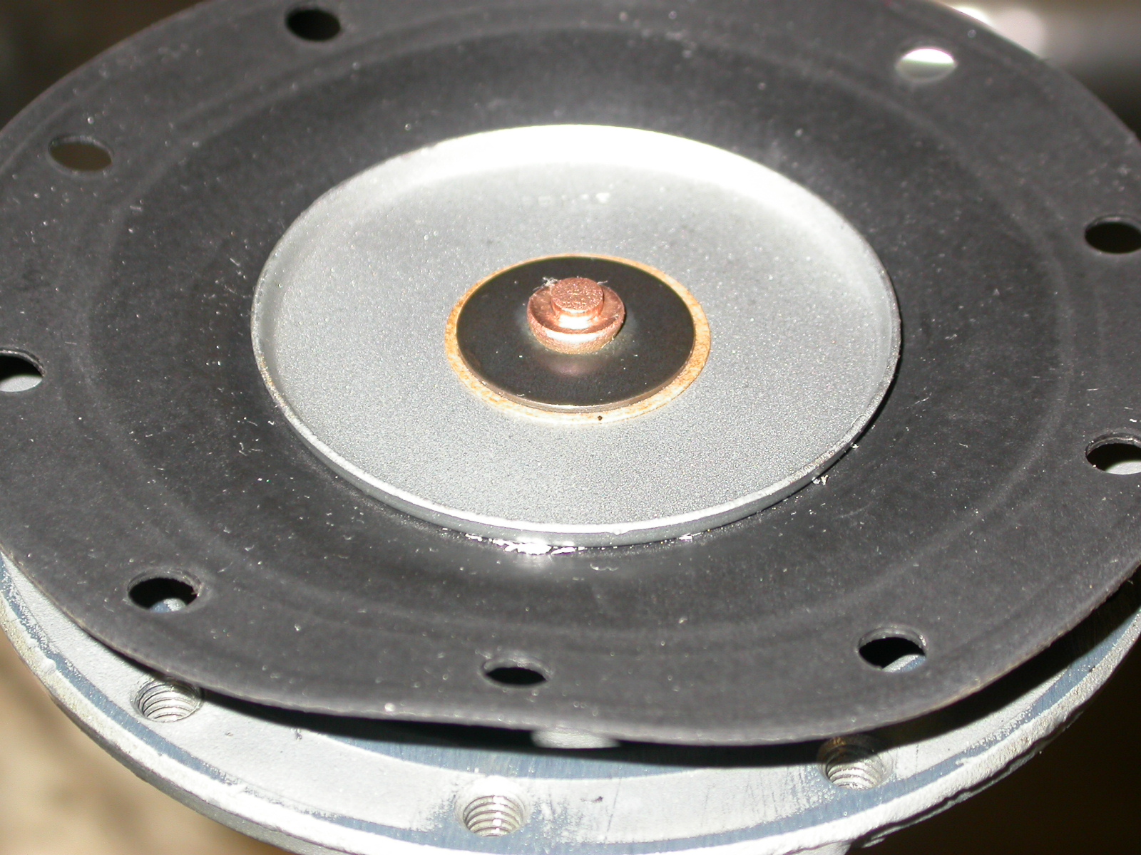 There's a surprise inside so be careful. Press the diaphragm down so the spring cant pop out when you remove the clevis pin. Take note of the assembly sequence. Also, notice the seal and copper ring pressed into the housing base. When the diaphragm leaks this seal helps to keep fuel from flooding the crank case.