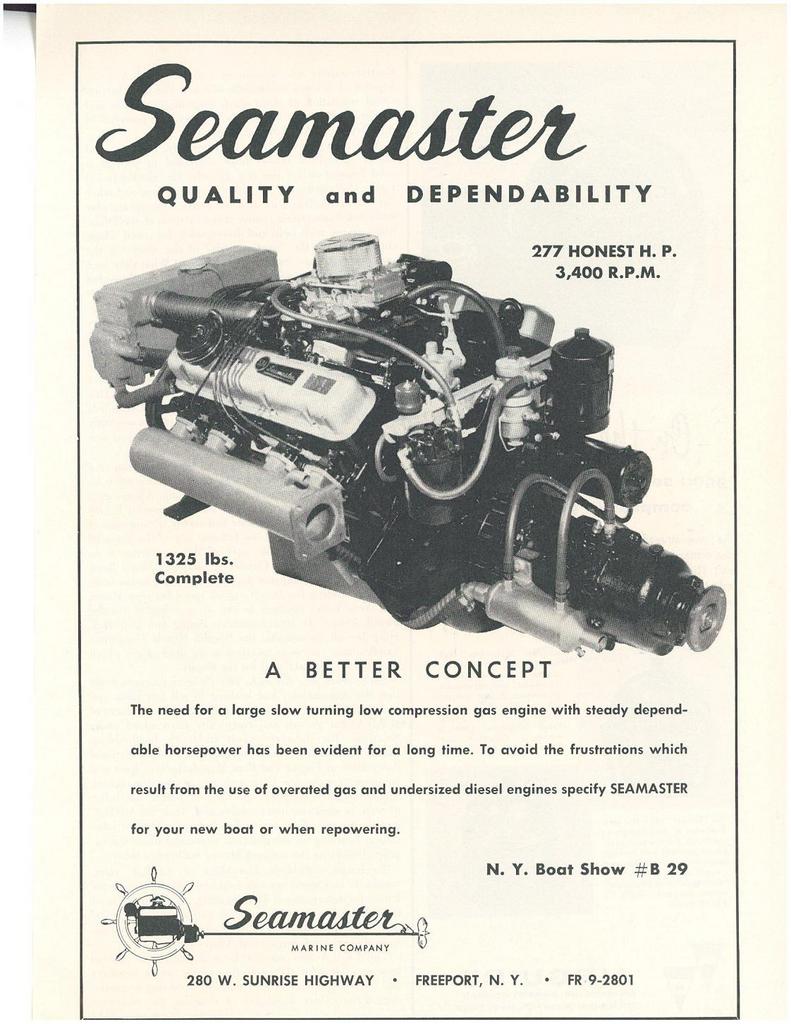 In the late 1960’s, OSCO purchased the SEAMASTER Marine Engine Co. and added to their existing product line a Seamaster "300" six cylinder gasoline engine, and two V8 gasoline models based on the 534 cu. In. Ford industrial engine. The most powerful Seamaster model boasted twin turbo chargers and inter-cooling way back in the early 1970’s.