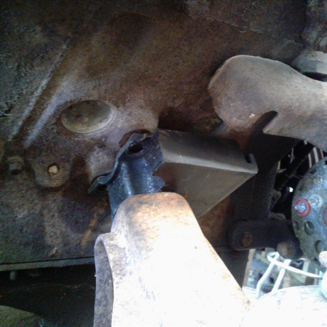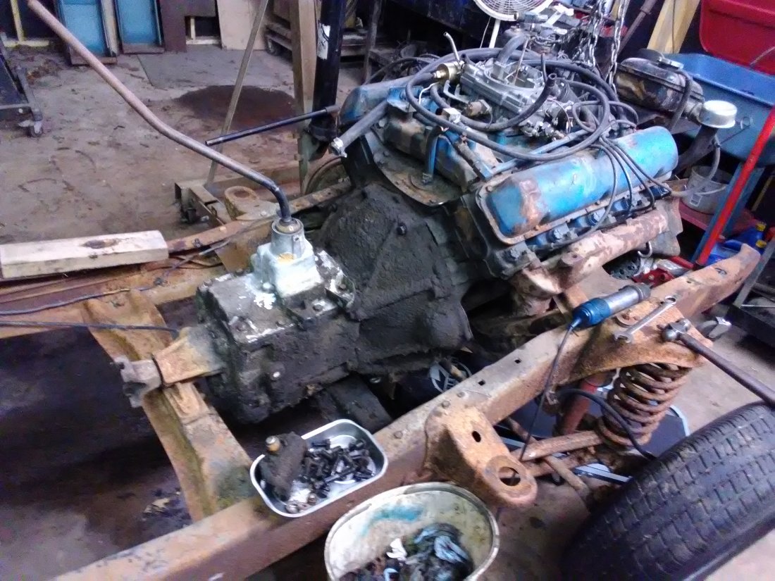 Swapped in the 63/64 Galaxie FE engine mounts and broke the Cruise-O-Matic loose. I have a 66 F-100 chassis that I am using for mock up. The 65 F-100 and F-250 2 wheel drives shared the same frame. As far as I know so does the 66, at least all the important areas are the same as the 65.