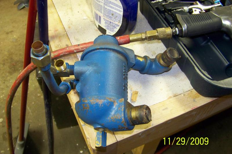 This is one of two solid bronze cast oil coolers, one for the transmission fluid, the other for oil. They interrupt the fresh water line, so they get a massive amount of cooling for such a small cooler. Made by the Gass mechanical corp, Baltimore.