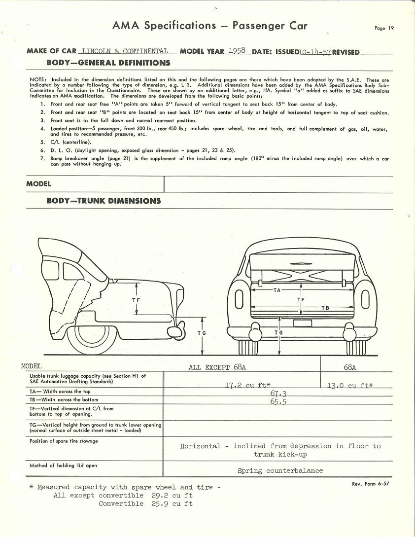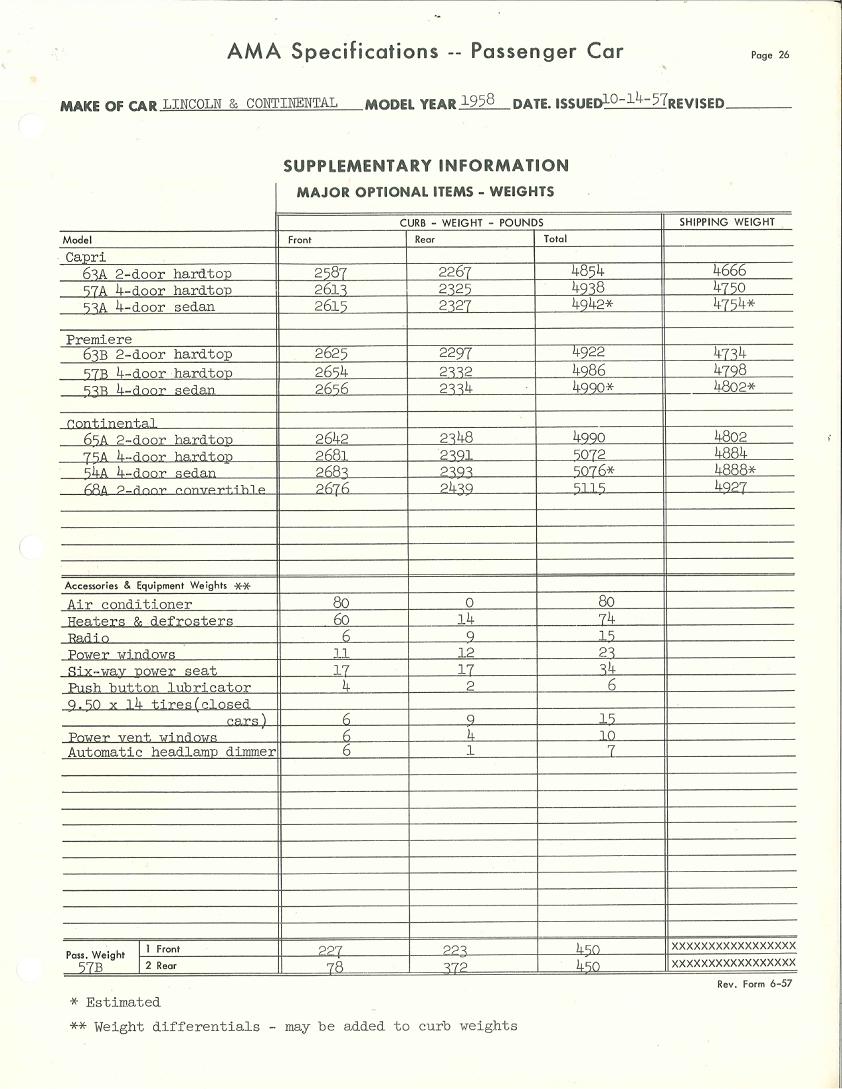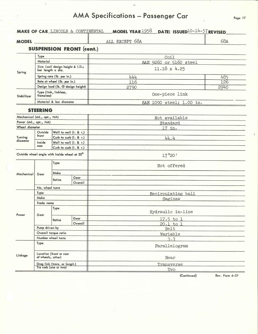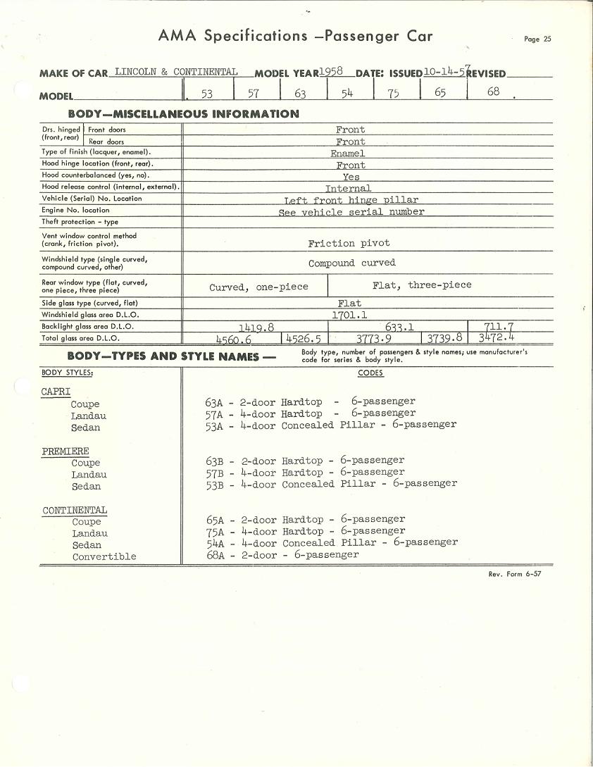 Re: 1958 Lincoln & Continental AMA Specifications (10-14-57)