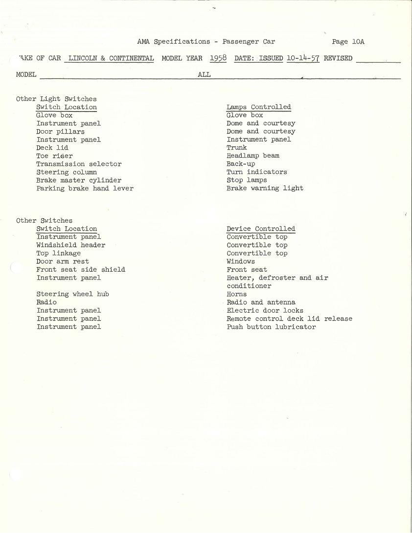 1958 Lincoln & Continental AMA Specifications (10-14-57)