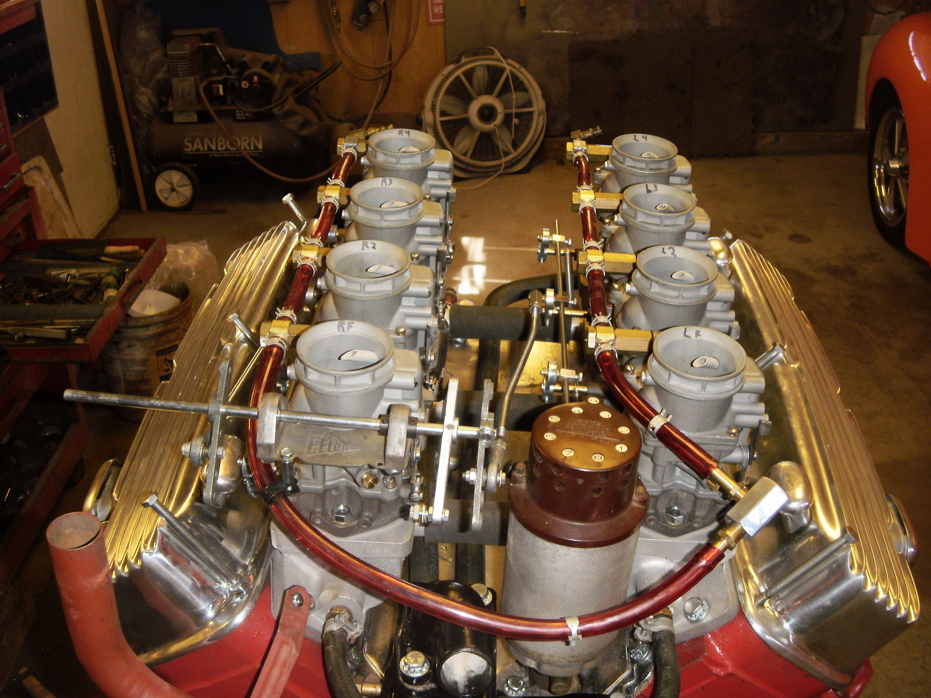 mock up of "race motor for lil abe 2 59 430 grooved crank main journals, precision blueprinted HV oil pump and drive rod NOS crankshaft co beamed and heat treated "nitro" rods 075 over 10.3 forged pistons re-ground isky roller cam int 9-49 ex 63-3 @050 int lift 604 ex lift 626 lunati roller lifters smith brothers 3/8 push rods mondello ported and polished heads stainless steel valves titanium retainers harland sharp roller tip rockers joe hunt magneto weiand drag star 8x2 stromberg EAB 94's NOS eelco ball bearing linkage note have since moved fuel line behind mag and will trim cross shaft