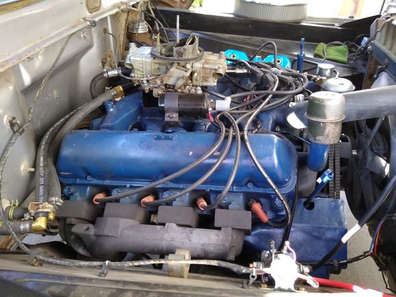 Better pics from today showing the exhaust manifold spacers on the passenger side to clear the higher starter mounting position on the FE bellhousing. Plug wires are off an old 351w project, hence the mismatched boots. Carb has a 2" four hole spacer under it so the Holley linkage clears the manifold and because well, why not?
