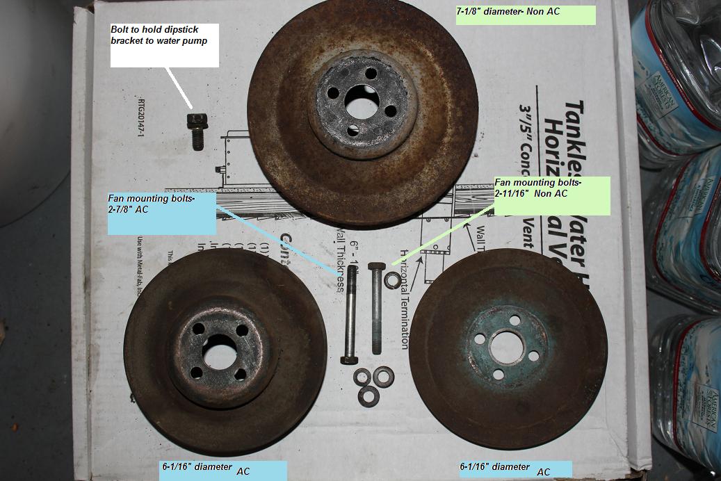 Posting some trivia here which may be helpful for people identifying fans and pulleys or contemplating instlaling AC on a non-AC car.