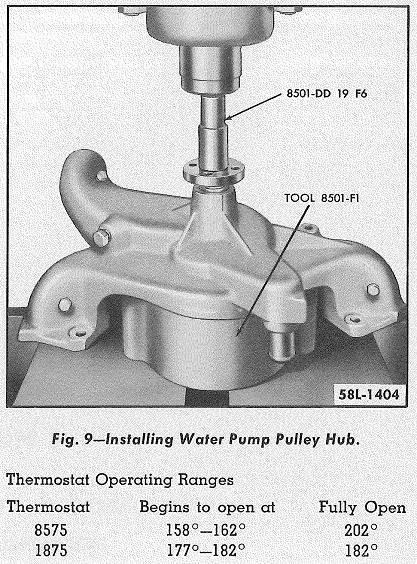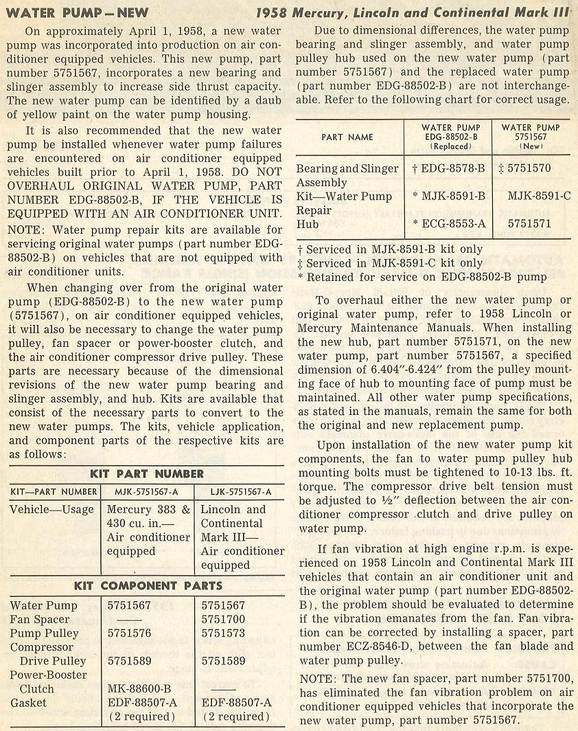 Image of an early 1958 water pump, from the 1958 Advance Service Manual for Lincoln (printed Sept. 1957). Note the square plugs which are absent on later designs. I've been searching for an early 58 pump for my restoration and have learned the difference between A/C and non-A/C water pumps was the size of the bearing. Non-A/C had a smaller bearing which went out sooner so it seems that most pumps were replaced with the larger bearing style.