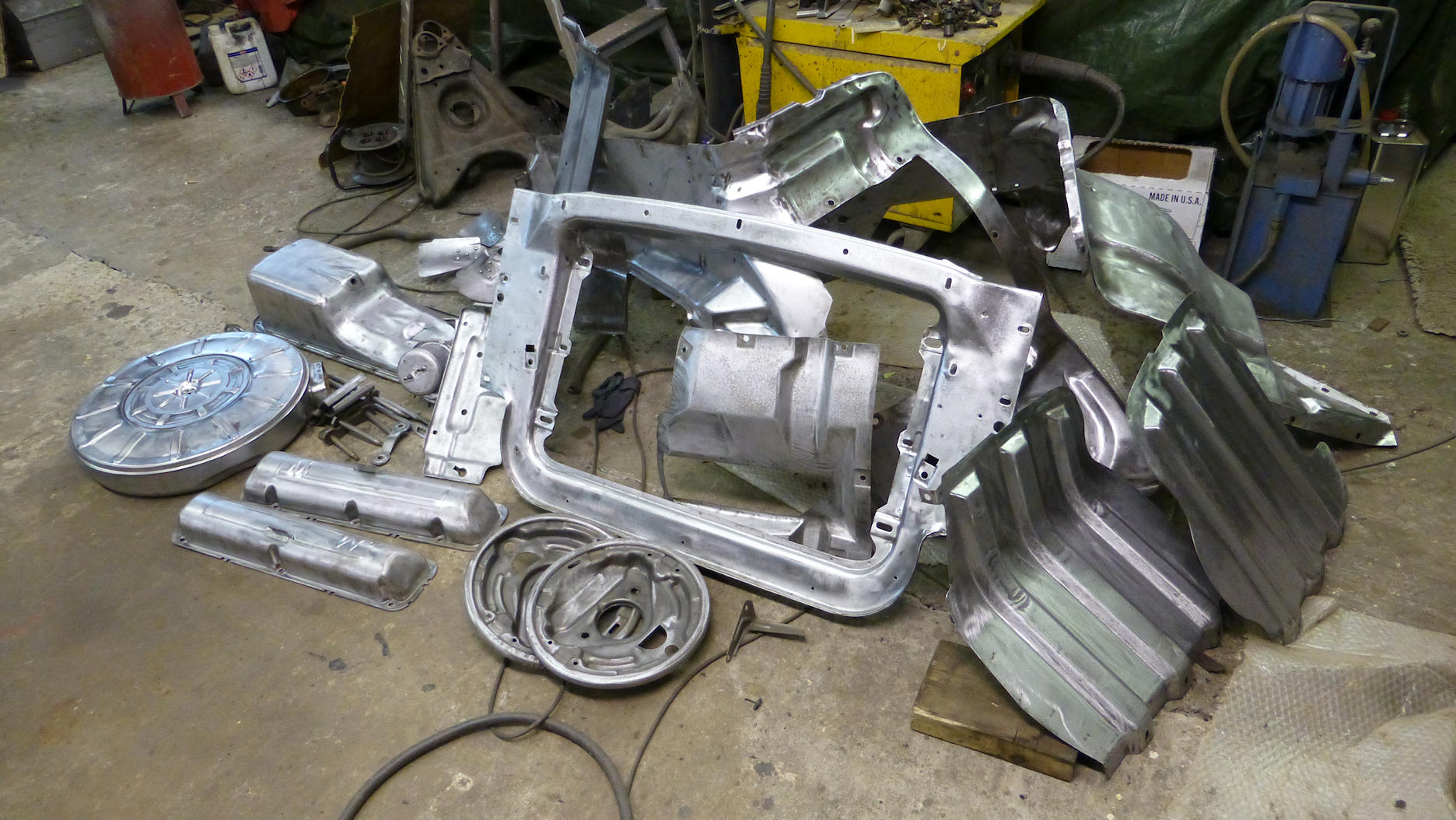 I've been doing a lot of boring dirty work this week, so the pile of parts ready for paint is growing every day. Here are the inner fenders, radiator support, battery tray and a lot of other parts for the front of the car stripped from undercoating, old paint and surface rust.