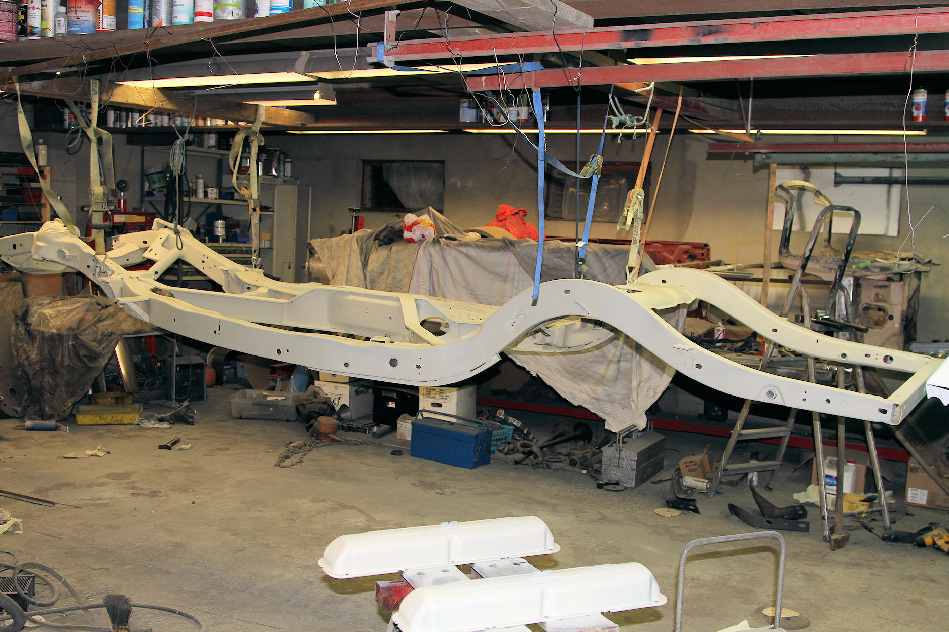 So I hung it up in my garage and started the paint prep work. The whole frame needed to be sanded to make the surface smooth and nice and I also used a little bondo here and there to remove signs of previous surface rust.