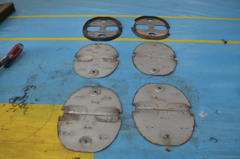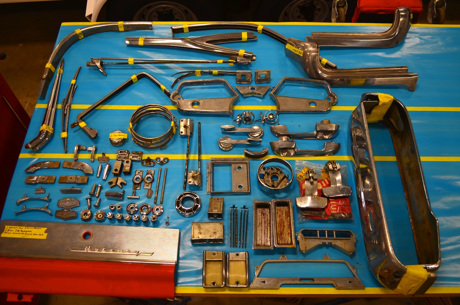 Suspension Wiring. As with the Colony Park wagon, very impressed. Door scuff plates Misc. screws, bolts, etc. for plating. All nicely labeled. A bunch of containers for plating Disassembly of the memory seat mechanism Venting / heating system disassembly