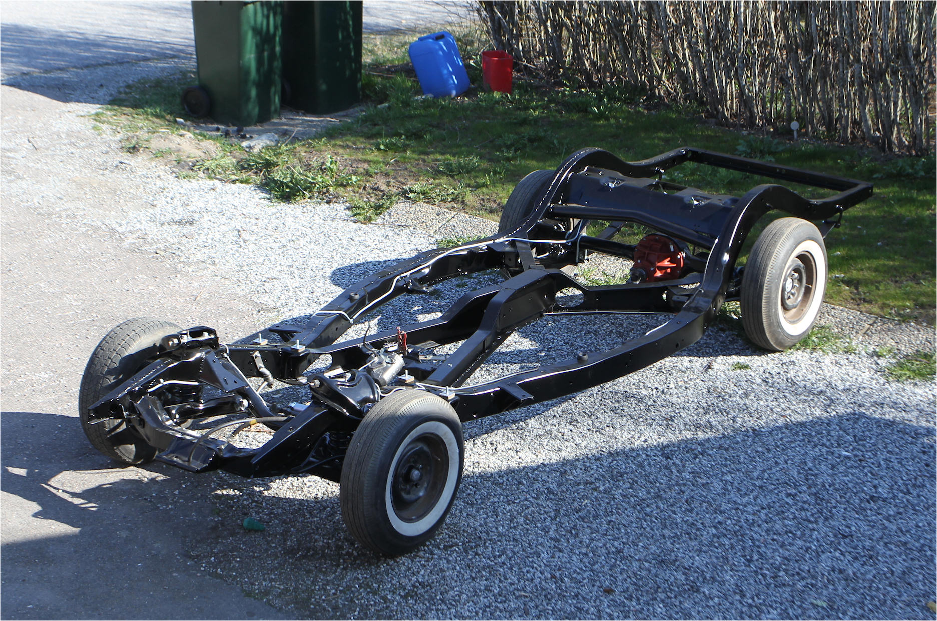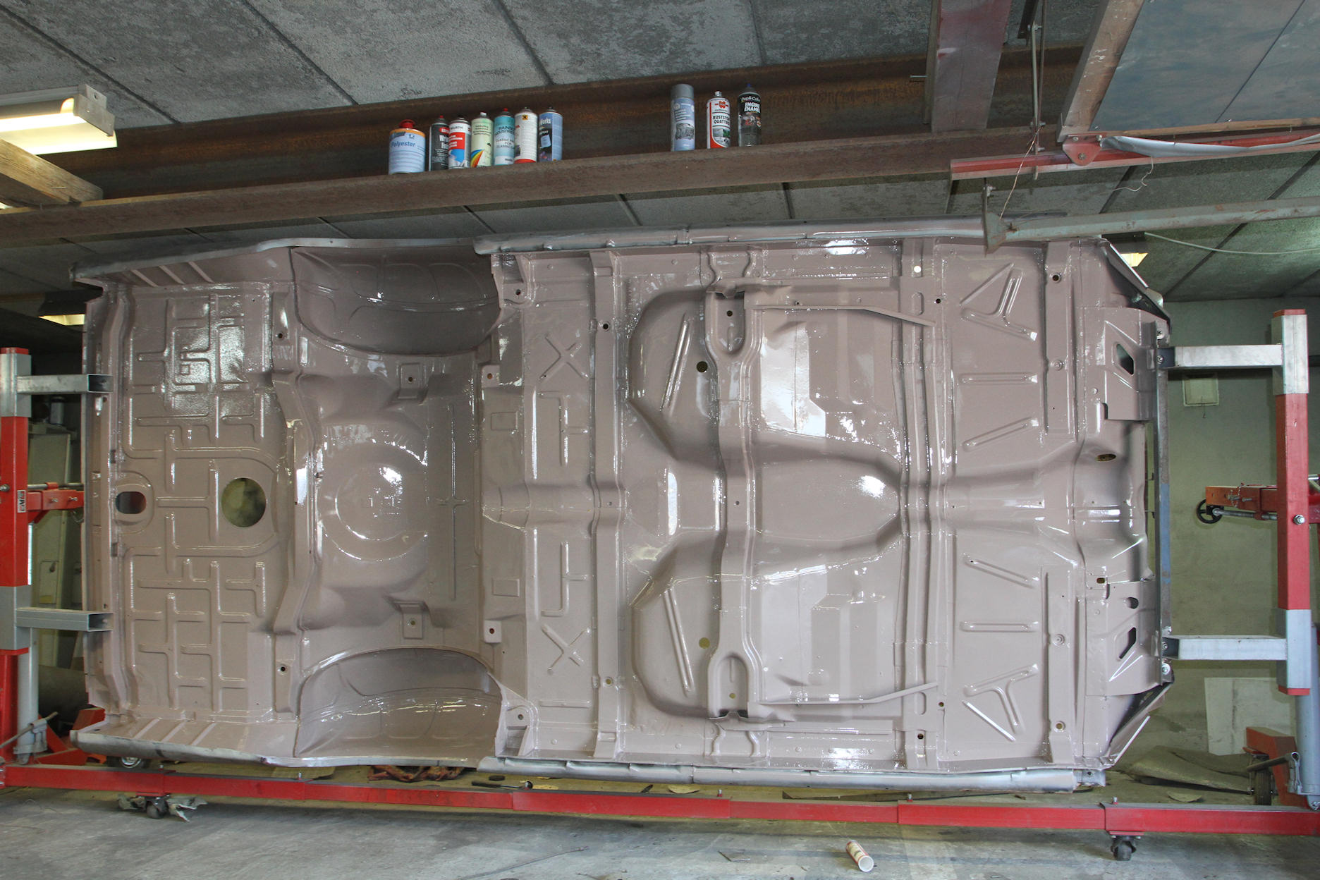 I Just painted the underside of the body. Luckily I have several liters with old fashion acrylic paint from back when it was super quality, cheap and easy to find. By mixing some leftover colors from previous restorations I managed to make a color pretty close to what originally had been used under this car. I call the color chocolate milk brown