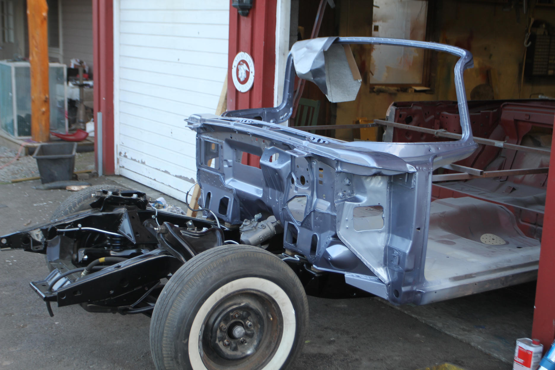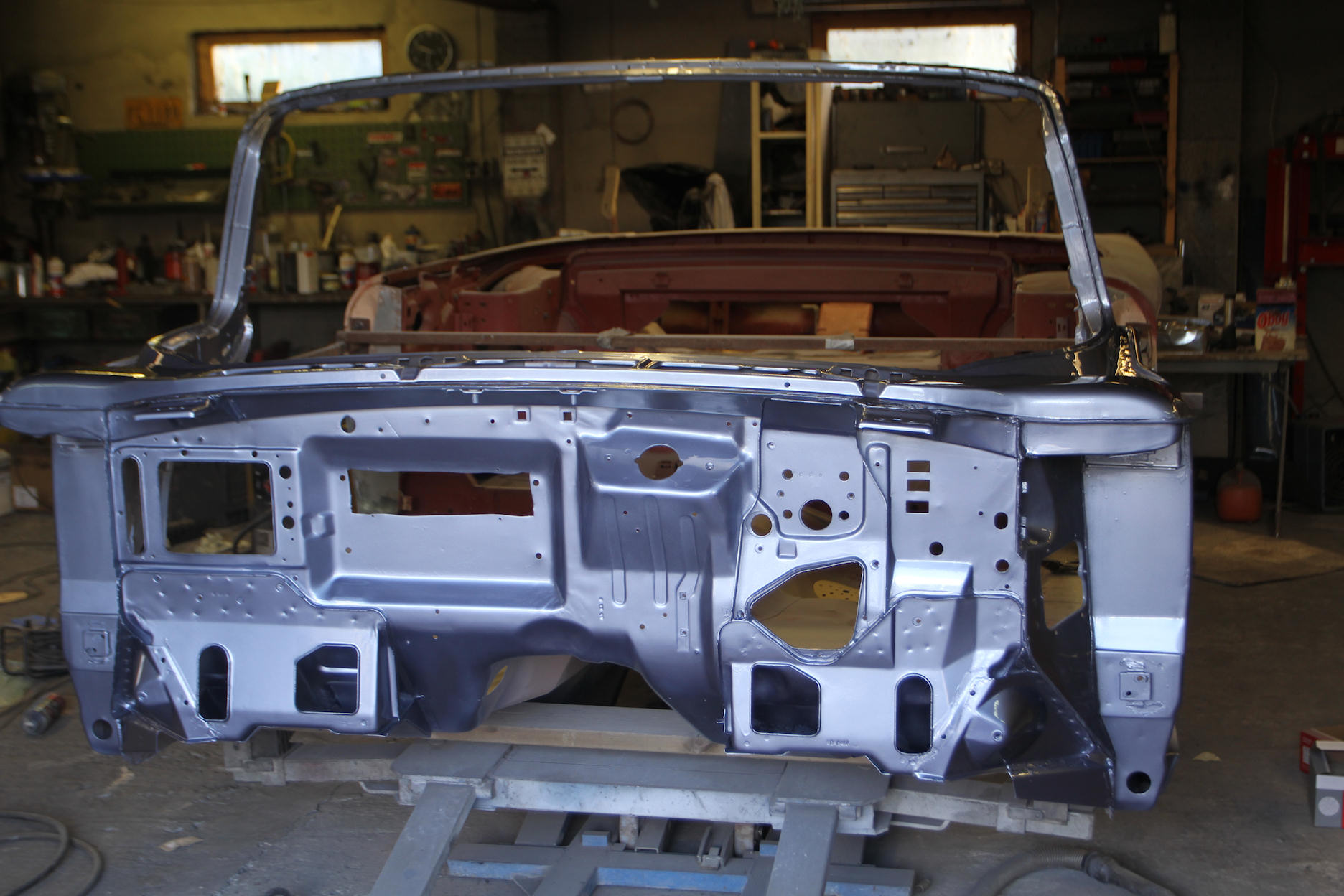 Got another down trip today as I placed the body back on the frame and took the car out in daylight to check the color on the firewall. As you can see there is not much violet in this color, so that means I have to lift the body again and repaint with a different color.