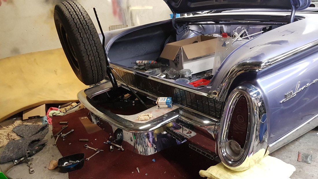 Finally it was time to get the continental kit and rear bumper installed on the car. This has been a real challenge, and I think that if I knew how much time and money it would take to realize it I would probably not have done it. I have made two of these and the one for my car was the forst one, so I practiccally made it twice because I had to re design it and modify so many things after I made the second one and got the experience from that. Here is a picture from the last test fit on the car and where I finally decided it was good enough.