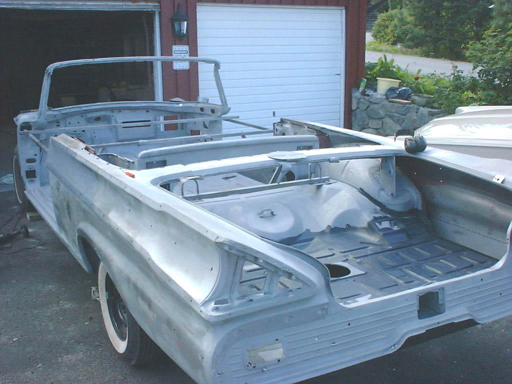My hardtop is becoming a convertible. All the convertible parts had been removed from the rusty convertible by drilling out the factory spot welds and then transplanted into the hardtop body so it would be near impossible to see that this car body was a hardtop. Some people would prefer to take the good parts from the hat parts car and transplant them over to the convertible, but in this case I think that would have made a not so good result in the end.